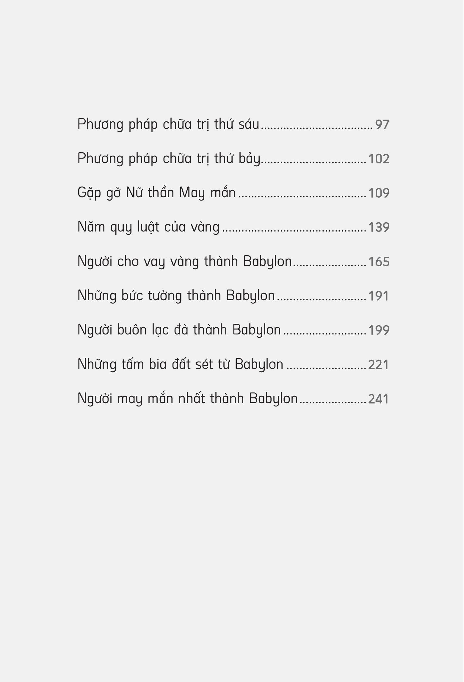 - Khổ sách: 13x19cm GIỚI THIỆU SẢN PHẨM Để thực hiện những tham vọng và khát khao của bản thân, bạn cần phải đạt được thành công về tiền bạc. Hãy sử dụng những nguyên tắc tài chính sẽ được giải thích rõ ràng trong những trang sách này. Hãy để chúng chỉ đường dẫn lối giúp bạn thoát khỏi những ràng buộc của một nguồn tài chính eo hẹp và vươn tới cuộc sống trọn vẹn hơn, hạnh phúc hơn nhờ có nguồn tài chính dồi dào. Cuốn sách Người Giàu Có Nhất Thành Babylon sẽ giúp bạn biết cách vận dụng những nguyên lý quan trọng để phát triển tài chính. Tác giả dẫn dắt bạn đi từ một hoàn cảnh khó khăn, tiêu biểu là một cái túi lép xẹp, đến một cuộc sống đầy đủ và hạnh phúc, tiêu biểu là một túi tiền căng phồng, sung túc. MỘT SỐ HÌNH ẢNH THAM KHẢO CAM KẾT