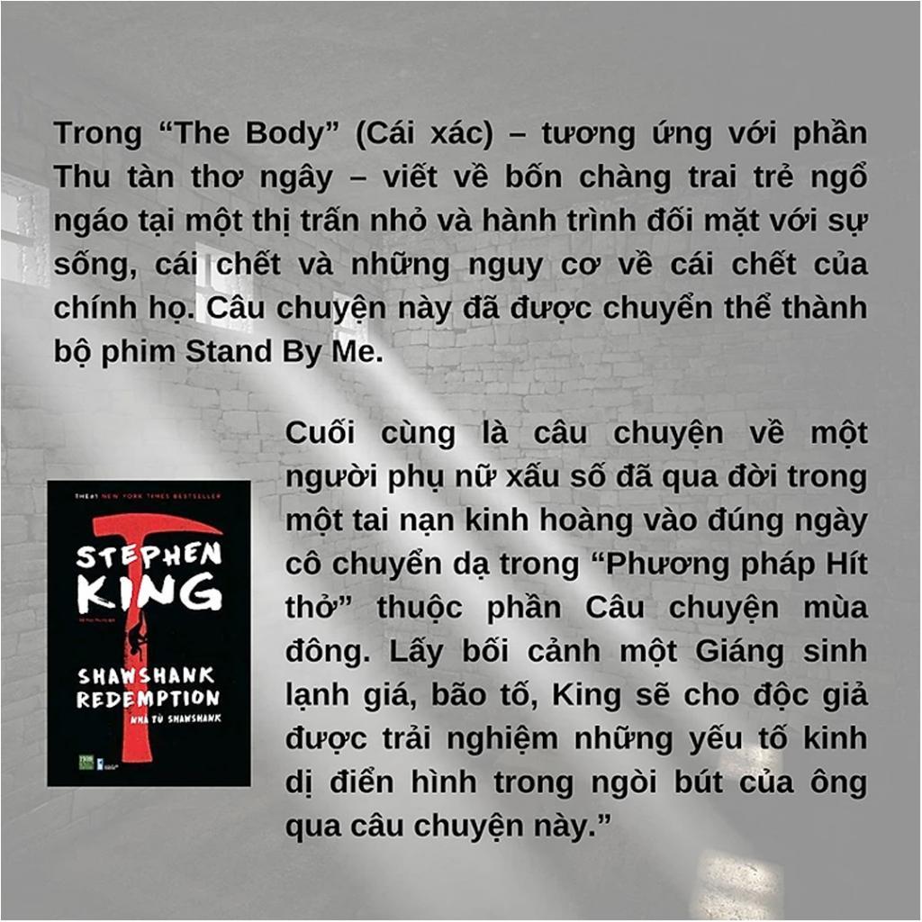 Truyện nói về Andy Dufresne một chủ ngân hàng bị kết án oan giết vợ phải ngồi tù chung thân tại nhà tù khét tiếng nhất bang là Shawshank. Khác hẳn với những con người đầu hàng số phận và sống buông xuôi tại những buồng giam, song sắt – Andy vẫn nuôi dưỡng kế hoạch vượt ngục trong mình.