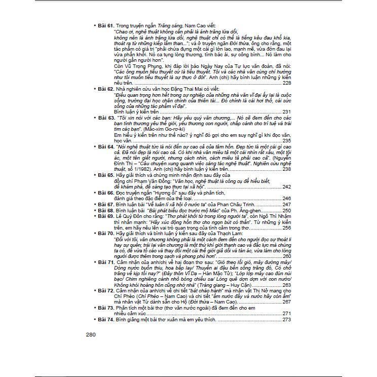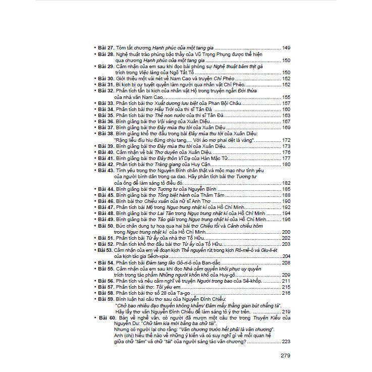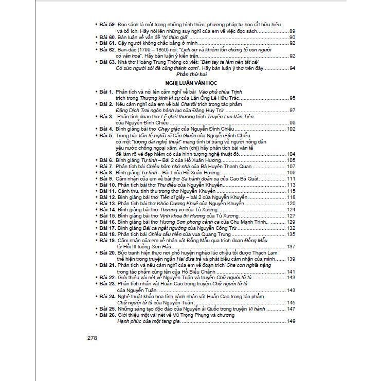 Phần thứ hai: Những bài văn nghị luận văn học. Các bài cảm nhận, phân tích, bình giảng một đoạn thơ, một bài thơ, một truyện, kí, một nhân vật, một chi tiết nghệ thuật (thuộc phạm vi Chương trình Ngữ văn 11); phần lớn là những bài văn hay, những bài văn đặc sắc đạt điểm cao trong các bài thi học sinh giỏi lớp 11.