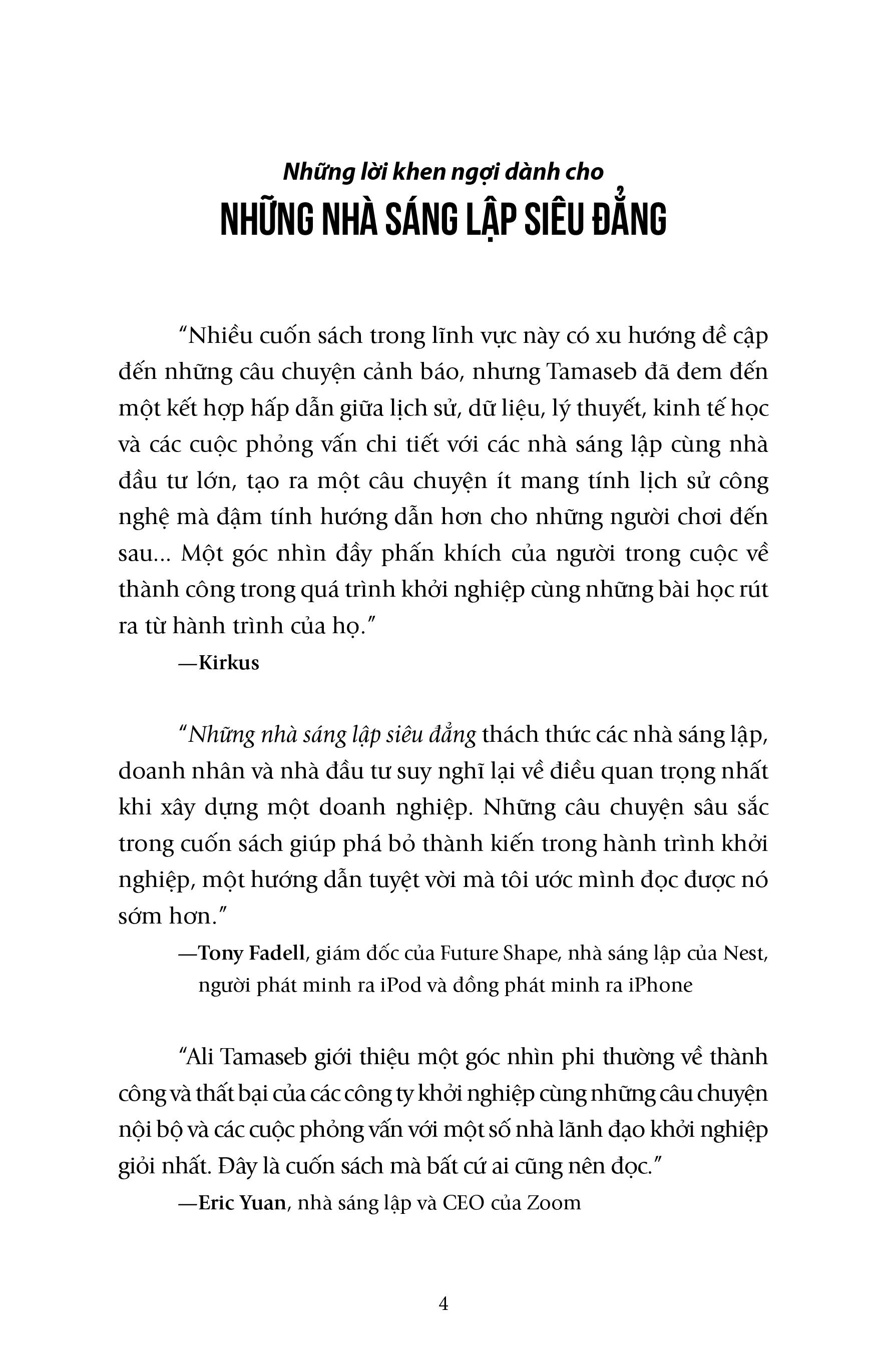 Điểm nổi bật đáng chú ý của Những nhà sáng lập siêu đẳng là tập dữ liệu có thể coi là lớn nhất từng được thu thập về các công ty khởi nghiệp, với mục đích so sánh các công ty khởi nghiệp trị giá hàng tỉ đô la với những công ty khởi nghiệp không thành công – 30.000 điểm dữ liệu trên rất nhiều yếu tố như số lượng đối thủ cạnh tranh, quy mô thị trường, tuổi của người sáng lập, xếp hạng trường đại học họ từng theo học, chất lượng của các nhà đầu tư, thời gian gây quỹ và còn nhiều hơn thế. Và những gì tác giả tìm thấy sau hàng nghìn giờ nghiên cứu và phân tích dữ liệu, trông khác xa so với mong đợi: