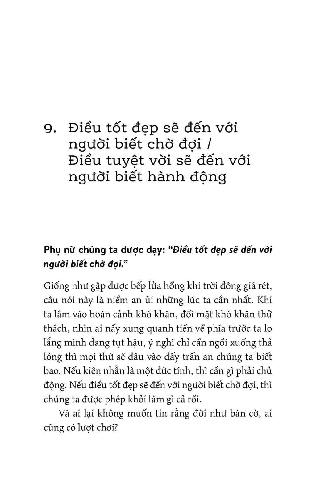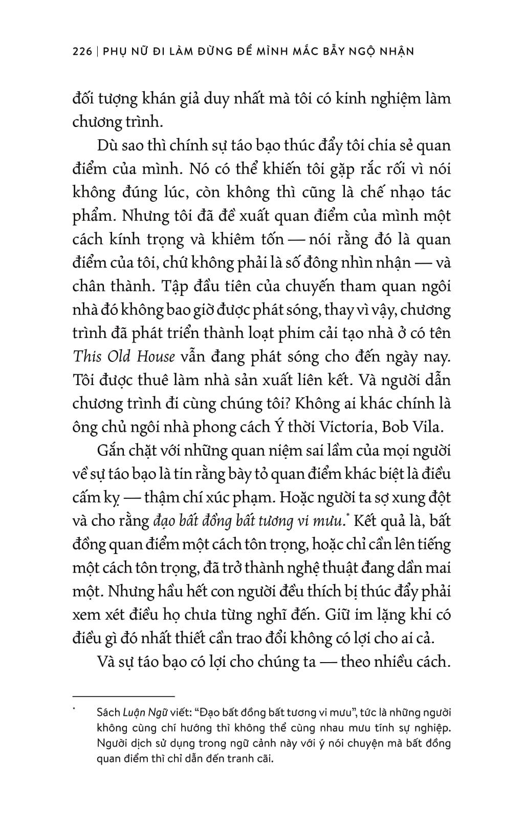 Rất có tâm, kiểu “chỗ chị em bảo nhau”, Bonnie Hammer vạch trần 15 quan niệm từ lâu đã thành khẩu hiệu hô hào, cài đặt não trạng phụ nữ bằng truyền thông đại chúng. Ở nơi làm việc, các quan niệm này biến thành những lời hứa hẹn, ngụy biện, ngộ nhận khiến cho phần lớn lao động nữ hoặc suốt đời giậm chân tại chỗ hoặc cảm thấy m.ình “không đủ giỏi”!