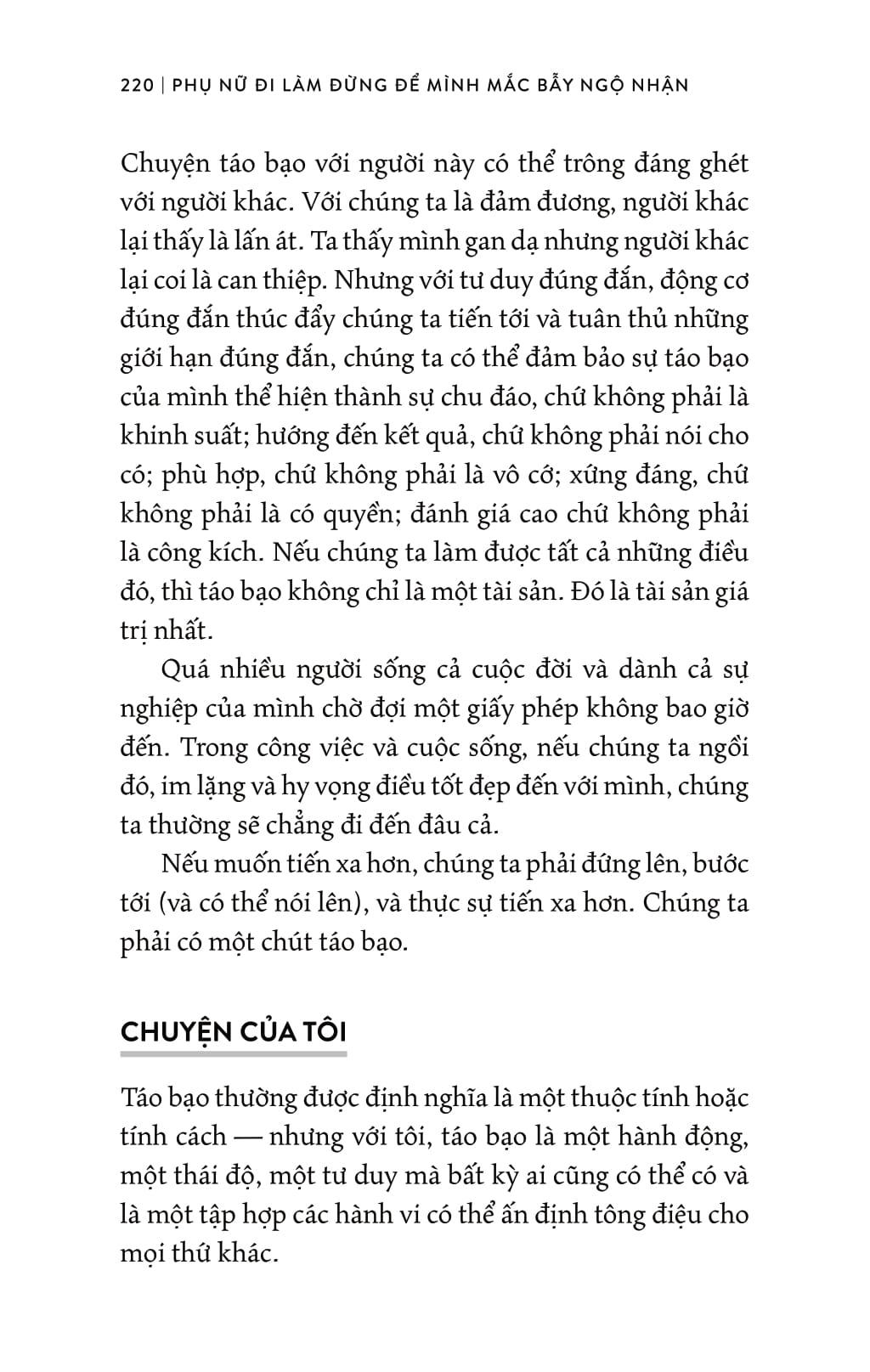 Chẳng hạn, quan niệm rất thường nghe: “Theo đuổi ước mơ”. Ngộ nhận về theo đuổi giấc mơ rất dễ đưa phụ nữ vào ngõ cụt! Sự thực là phải biết nhìn ra và biết cách “Theo đuổi cơ hội.” Hoặc “Biết giá trị của m.ình” sao bằng “Biết làm cho m.ình có giá trị”... Và rất nhiều lầm tưởng lẫn ngộ nhận khác mà chắc chắn phụ nữ đi làm nào cũng sẽ bắt gặp chính m.ình trong ít nhất hơn một điều. Rất dễ liên hệ trong thế giới phụ nữ công sở và nữ doanh nhân!