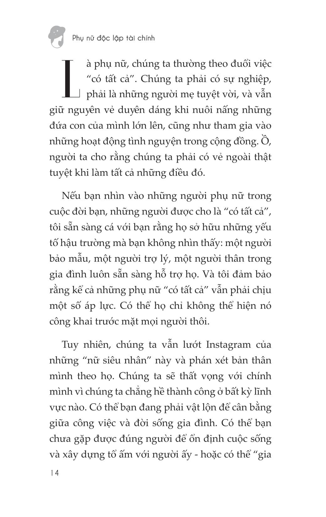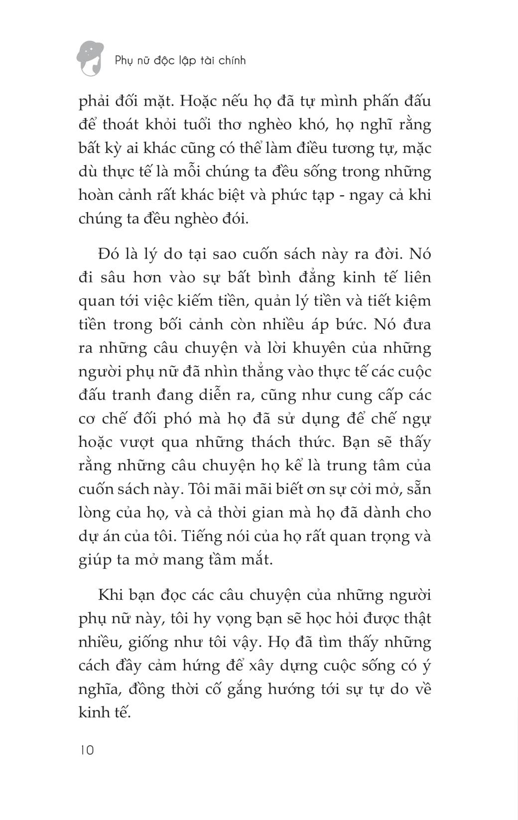 Cuốn sách này tập trung khai thác một sự thật ít được nhìn nhận thẳng thắn, rằng tiền bạc của phụ nữ chịu ảnh hưởng lớn bởi định kiến xã hội, vai trò giới, và những áp lực mang tính hệ thống. Từ việc phụ nữ bị trả lương thấp hơn, gặp bất công trong đàm phán, cho đến bị định hình bởi những quan niệm cũ kỹ về “người mẹ hoàn hảo” hay “nữ siêu nhân”, Brynne Conroy đã bóc tách những tầng lớp cấu thành nên sự bất bình đẳng kinh tế hiện đại. Cô không né tránh thực tế, mà đối mặt và viết lại một định nghĩa mới về “thịnh vượng”, không chỉ là tài sản, mà là tự chủ, sức khỏe tinh thần, kết nối xã hội và cảm giác hài lòng với chính m.ình.