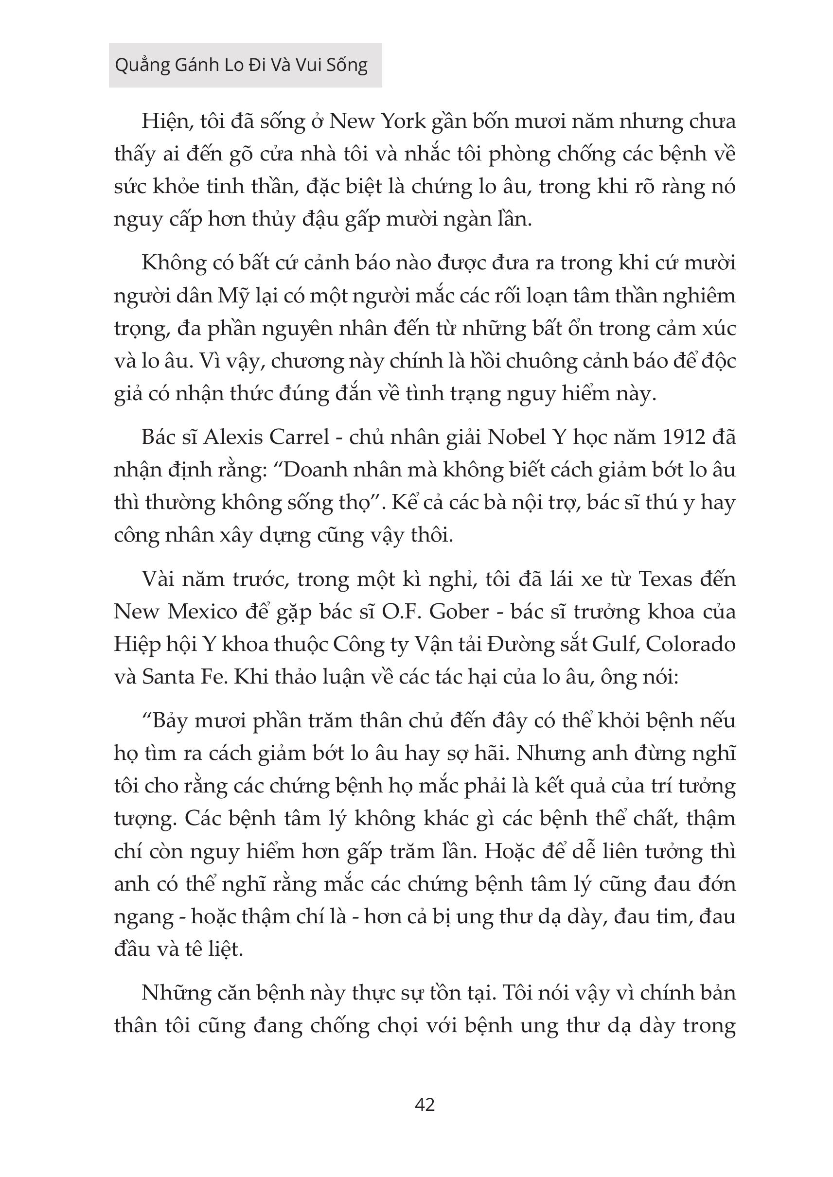 - Số trang: 260 GIỚI THIỆU SÁCH Sau Đắc Nhân Tâm thì Quẳng gánh lo đi và vi sống (How to Stop Worrying and start living) là một trong những cuốn sách bán chạy nhất trên thế giới. Bất kỳ ai đang sống đều sẽ có những lo lắng thường trực về học hành, công việc, những hoá đơn, chuyện nhà cửa,... Cuộc sống không dễ dàng giải thoát bạn khỏi căng thẳng, ngược lại, nếu quá lo lắng, bạn có thể mắc bệnh trầm cảm. Quẳng Gánh Lo Đi Và Vui Sống khuyên bạn hãy khóa chặt dĩ vãng và tương lai lại để sống trong cái phòng kín mít của ngày hôm nay. Mọi vấn đề đều có thể được giải quyết, chỉ cần bạn bình tĩnh và xác định đúng hành động cần làm vào đúng thời điểm. Cuốn sách được viết ra bởi người tự nhận mình là "một trong những kẻ bất hạnh nhất New York " nhưng chỉ sau một thời gian ngắn bằng những nỗ lực vượt bậc của mình, ông đã trở thành 1 người xuất trúng được hàng triệu người biết đến. Cuốn sách là tập hợp các quy tắc giúp bạn giải quyết những cảm xúc tiêu cực, lo lắng và buồn bã. Không chỉ đưa được người đọc đến một cuộc sống thú vị và trọn vẹn hơn mà còn giúp chúng ta nhận thức rõ về bản thân và cả những người xung quanh SƠ LƯỢC VỀ NỘI DUNG Cuốn sách bao gồm 10 phần khác nhau, với rất nhiều những kinh nghiệm và các lời khuyên từ tác giả cũng như những người đi trước, giúp bạn có thể nhận thức được những điều đúng đắn nhất. Chi tiết