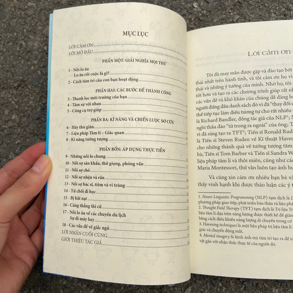 Sách: Sơ Cứu Tâm Trí Con Trẻ Lo âu là cảm giác mà chúng ta trải qua trước một sự kiện căng thẳng – nói cách khác, đó là phản ứng của chúng ta đối với một điều gì đó chưa xảy ra. Nỗi lo âu của chúng ta trở nên nghiêm trọng thế nào phụ thuộc rất nhiều vào suy nghĩ của ta. Chúng ta có thể khiến nó tồi tệ hơn chỉ bằng việc suy nghĩ quá nhiều hoặc sợ hãi những tình huống sắp xảy ra. Đa số sẽ đồng ý rằng chúng ta có thể kiệt sức vì lo lắng vô cớ, trong khi thực tại thường tốt đẹp hơn rất nhiều so với những viễn cảnh mà ta dự đoán trong đầu. các nhà tâm lí học sẽ gọi lo âu là một điều sản sinh từ “tổn thương” cảm xúc trong tâm trí thay vì xem nó là một “chứng rối loạn”, bởi vì từ ấy sẽ ngay lập tức gợi ra cảm giác rằng lo âu thuộc về một vấn đề lâu dài và là thứ khiến ta “khổ sở”. Trên thực tế, giờ chúng ta đã có thể chữa lành vết thương cảm xúc thay vì để nó mưng mủ và biến thành một thứ gì đó nghiêm trọng hơn. Vì vậy, nếu con cái chúng ta có thể có những vết va đập và trầy xước bên ngoài cơ thể, thì chúng ta cũng không nên ngạc nhiên khi phát hiện ra rằng lũ trẻ cũng có thể bị một vài vết xước ở bên trong. Chúng ta đã quen với việc chăm sóc sức khỏe thể chất của bản thân rồi, hãy ngẫm lại lần cuối bạn bị bệnh vì đau bụng không rõ nguyên nhân hoặc trật mắt cá xem. Điều đầu tiên mà hầu hết chúng ta làm là lên mạng Internet để tra cứu, và hành động này vô cùng hợp lí vì ta biết rằng mình sẽ tìm thấy những lời khuyên hữu ích ở đó – những điều sẽ giúp chúng ta mau cảm thấy khỏe hơn. Thế nhưng, chăm sóc sức khỏe tâm thần của bản thân thì lại là một câu chuyện khác. Khi sống trong xã hội, chúng ta tránh nói về “những vấn đề của tâm trí”, cảm thấy cách tốt nhất để giải quyết những vấn đề này là tỏ ra kiên cường hoặc để cho các chuyên gia xử lí – nhưng dù có vậy, chúng ta vẫn không rõ kiểu chuyên gia nào mới là phù hợp với mình. Nỗi sợ về sự hiểu biết qua loa của bản thân này khiến nhiều người trong chúng ta phải sống lay lắt, vật lộn với những cơn lo âu hoặc chứng ám ảnh gây ra hạn chế cho chúng ta bằng nhiều cách khác nhau. Sống với cảm giác lo âu có thể gây ra những hậu quả lâu dài và khắc nghiệt, trẻ em có thể “phát triển” thành thứ chúng sợ thay vì thoát khỏi cảm xúc đó. Lo âu có thể làm chậm quá trình phát triển cảm xúc và cản trở hoạt động của trẻ trong mọi lĩnh vực của cuộc sống. Nó sẽ ngăn con bạn kết bạn, tham gia các hoạt động xã hội, làm bài thi tốt và phát huy hết tiềm năng của chúng. Tệ hơn nữa, những người bị lo âu và trầm cảm khi còn nhỏ có khả năng mang theo các vấn đề này tới tuổi trưởng thành. “Cuốn sách này sẽ là một sự hỗ trợ đắc lực cho rất nhiều bậc cha mẹ bằng cách giúp họ hiểu rằng lo âu thật ra là một phần của những bận tâm thường nhật thời thơ ấu và không cần phải xem nó là một thảm họa. Alicia Eaton đưa ra rất nhiều l