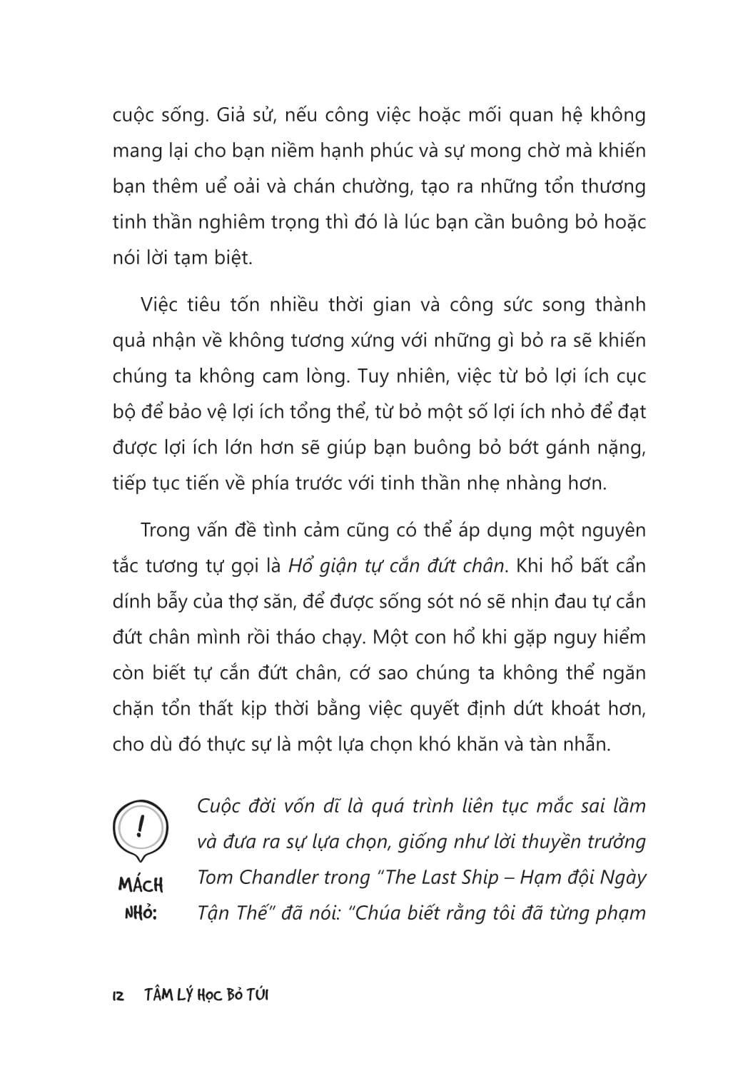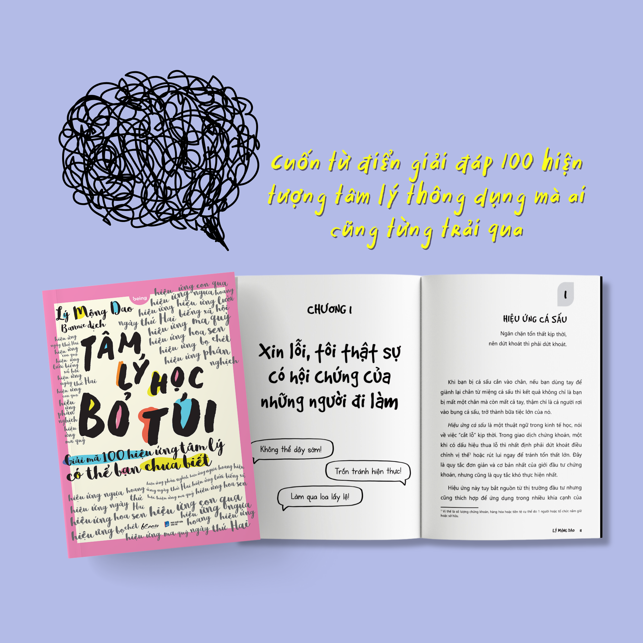 Tâm lý học bỏ túi – cuốn từ điển giải đáp 100 hiện tượng thông dụng mà ai cũng từng trải qua như: xu hướng tiêu cực về bản thân khi bị chê trách, né tránh khi nghĩ đến ngày thứ Hai đầu tuần, tiếc nuối hối hận trước những thứ không có được hoặc bỏ lỡ,...
