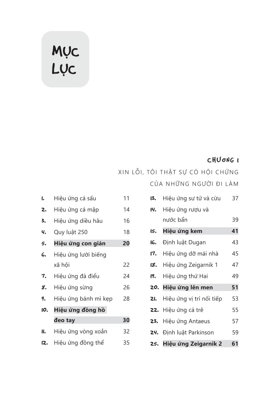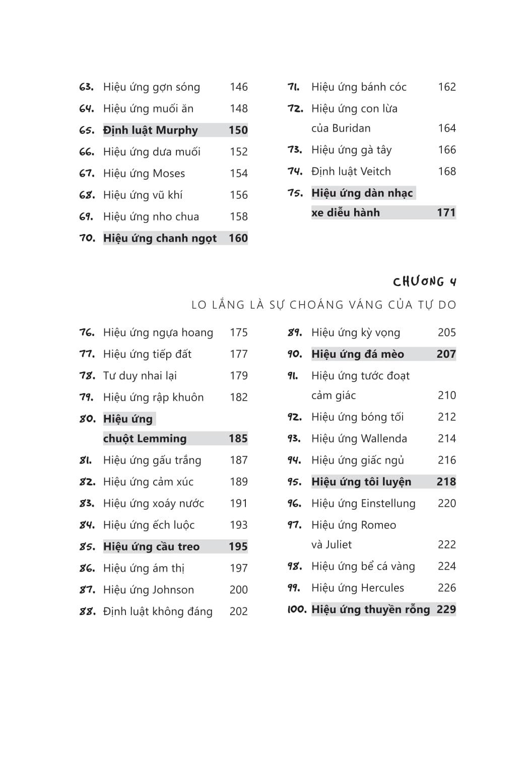 Tập trung chính vào bốn khía cạnh cuộc sống: cải thiện bản thân, xây dựng thái độ sống, quản lý cảm xúc, đối phó tình huống tại nơi học tập và làm việc. 100 hiệu ứng tâm lý tưởng chừng “đồ sộ” này lại là mẹo nhỏ giúp bạn thoát khỏi căn bệnh “dị ứng cuộc sống” và tìm thấy dũng khí để yêu cuộc đời thêm một chút.