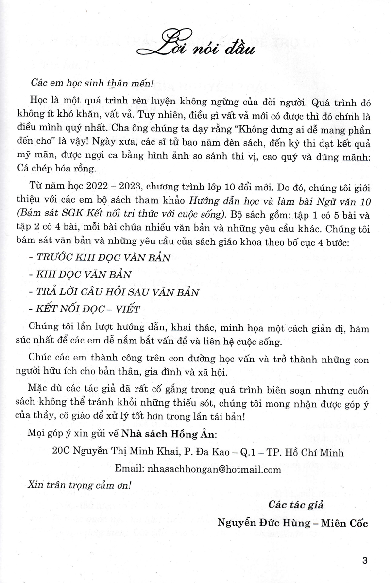Các em học sinh thân mến! Học là một quá trình rèn luyện không ngừng của đời người. Quá trình đó không ít khó khăn, vất vả. Tuy nhiên, điều gì vất vả mới có được thì đó chính là điều mình quý nhất. Cha ông chúng ta dạy rằng “Không dừng ai dễ mang phần đến cho” là vậy! Ngày xưa, các sĩ tử bao năm đèn sách, đến kỳ thi đạt kết quả mỹ mãn, được ngợi ca bằng hình ảnh so sánh thi vị, cao quý và dũng mãnh: Cá chép hóa rồng. Từ năm học 2022 – 2023, chương trình lớp 10 đổi mới. Do đó, chúng tôi giới thiệu với các em bộ sách tham khảo Hướng Dẫn Học Và Làm Bài Ngữ Văn 10 (Bám Sát SGK Kết Nối Tri Thức Với Cuộc Sống).