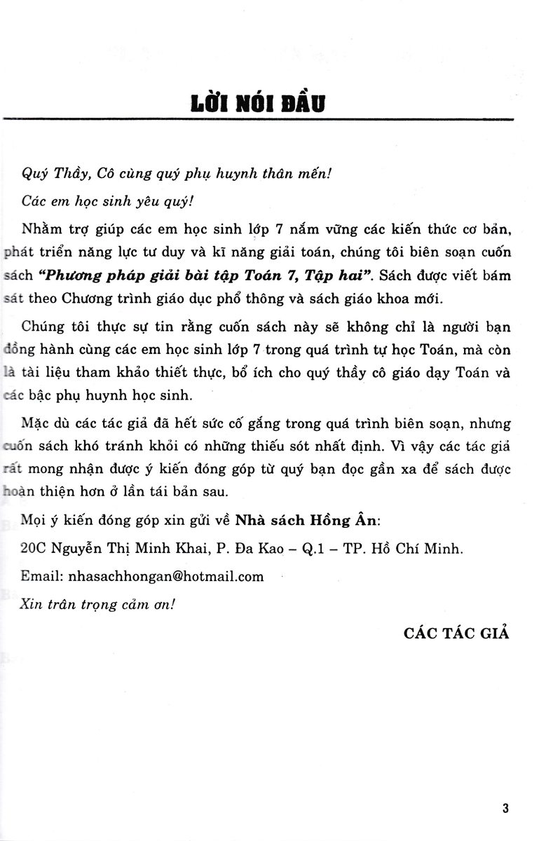 Chúng tôi thực sự tin rằng cuốn sách này sẽ không chỉ là người bạn đồng hành cùng các em học sinh lớp 7 trong quá trình tự học Toán, mà còn là tài liệu tham khảo thiết thực, bổ ích cho quý thầy cô giáo dạy Toán và các bậc phụ huynh học sinh .