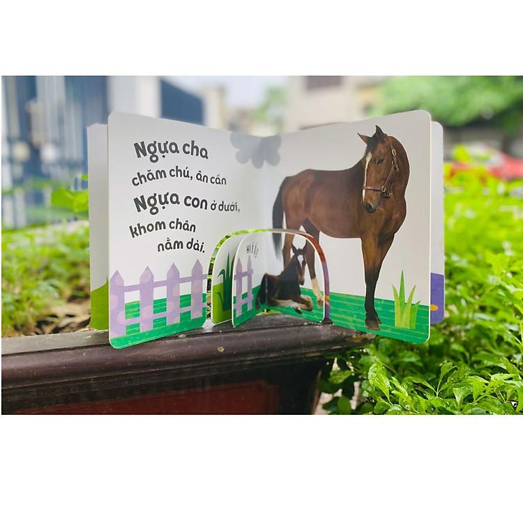 - Sách to ôm sách nhỏ - Động vật ở trong rừng Sách được thiết kế thành hai mảng, một mảng gọi là “sách to” ôm trọn lấy một mảng “sách nhỏ”. Sách nhỏ vẽ hình các bé động vật, sách to vẽ hình “cha mẹ” của chúng. Nhiệm vụ của bé là ghép mảng sách nhỏ vào mảng sách lớn sao cho chính xác, tạo thành một bức tranh hoàn chỉnh. Bộ sách rất đơn giản với các hình vẽ to, rõ nét, nhưng mang lại cho trẻ rất nhiều lợi ích: Giúp trẻ phát triển thị giác qua những ảnh động vật được minh họa sống động, sát với thực tế. Trẻ cũng hiểu được các bé động vật và cha mẹ của chúng có đặc điểm giống và khác như như thế nào qua tranh minh họa. Giúp trẻ phát triển vận động tinh đôi tay. Thông qua việc lật tìm và ghép các mảng sách nhỏ và sách tỏ, trẻ được rèn luyện các khớp ngón tay linh hoạt hơn, giúp trẻ phát triển thành thạo các cơ cho việc cầm, nắm, viết, vẽ…phục vụ sinh hoạt và học tập Nội dung sách là các câu thơ ngắn miêu tả từng loài động vật. Các vần thơ rất dí dỏm, trẻ dễ đọc, dễ nhớ, giúp trẻ nhanh chóng đọc theo và phát triển tốt ngôn ngữ Qua sách, trẻ dễ dàng nhận biết và hiểu được đặc điểm của các loài động vật khác nhau: ngựa vằn đồng cỏ có vằn trắng, vằn đen; con bò kêu là “ụm ò”; con voi phun nước “phụt” một cái; con sư tử khi gãi ngứa sẽ phát ra tiếng “sồn sột” Thiết kế sách được lấy cảm hứng từ những chiếc ôm của ba mẹ dành cho con cái, mong muốn khi cha mẹ cùng con trẻ đọc sách sẽ gửi gắm thêm được nhiều tình yêu thương đặc biệt.