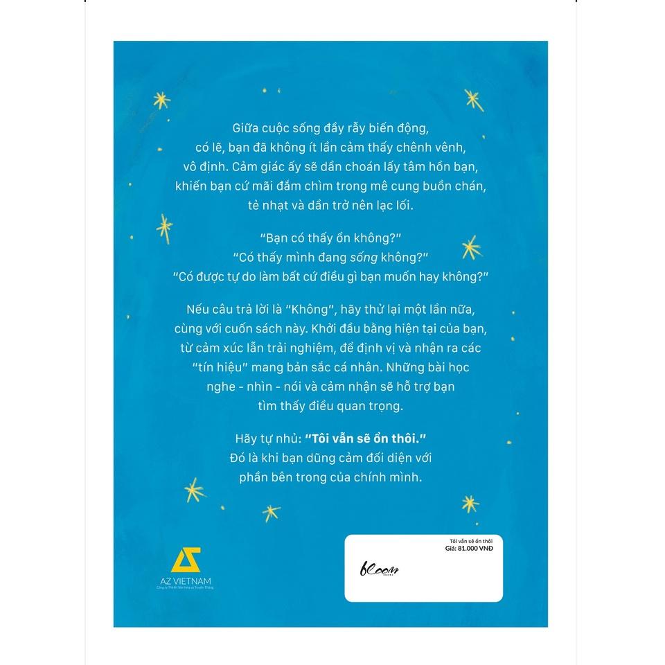 Giới thiệu: Giữa cuộc sống đầy rẫy biến động, có lẽ, bạn đã không ít lần cảm thấy chênh vênh, vô định. Cảm giác ấy sẽ dần choán lấy tâm hồn bạn, khiến bạn cứ mãi đắm chìm trong mê cung buồn chán, tẻ nhạt và dần trở nên lạc lối. “Bạn có thấy ổn không?” “Có thấy mình đang sống không?” “Có được tự do làm bất cứ điều gì bạn muốn hay không?” Nếu câu trả lời là “Không”, hãy thử lại một lần nữa, cùng với cuốn sách này. Khởi đầu bằng hiện tại của bạn, từ cảm xúc lẫn trải nghiệm, để định vị và nhận ra các “tín hiệu” mang bản sắc cá nhân. Những bài học nghe - nhìn - nói và cảm nhận sẽ hỗ trợ bạn tìm thấy điều quan trọng. Hãy tự nhủ: “Tôi vẫn sẽ ổn thôi.” Đó là khi bạn dũng cảm đối diện với phần bên trong của chính mình.