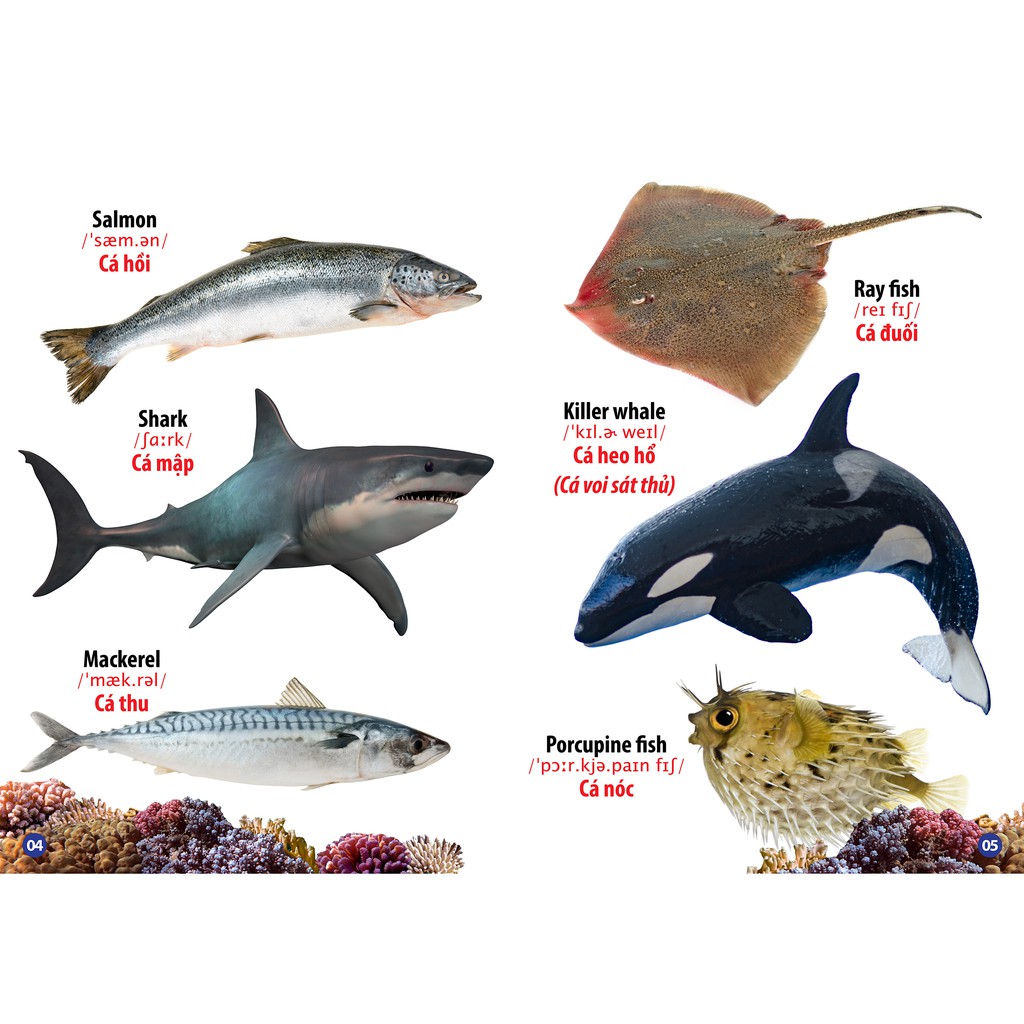 Thông qua các loài như: động vật dưới và biể những bức ảnh sặc sỡ cùng các khung hình sống động sẽ tái hiện lại cuộc sống muôn loài trên Trái đất, đồng thời giúp bé phát triển kĩ năng quan sát, xây dựng vốn từ vựng tiêng Anh phong phú về động vật, giúp bé khám phá thế giới động vật dưới nước muôn màu.