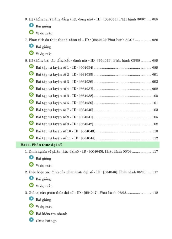 • Tự học Toán 8 – Tập 1 gồm 5 chương, xoay quanh hai mạch kiến thức: Số và Đại số, Một số yếu tố Thống kê và Xác suất. PHẦN I: SỐ VÀ ĐẠI SỐ Chương 1: BIỂU THỨC ĐẠI SỐ Chương 2: HÀM SỐ VÀ ĐỒ THỊ Chương 3: PHƯƠNG TRÌNH PHẦN II: MỘT SỐ YẾU TỐ THỐNG KÊ VÀ XÁC SUẤT Chương 4: MỘT SỐ YẾU TỐ THỐNG KÊ Chương 5: MỘT SỐ YẾU TỐ XÁC SUẤT Tập 2 : Hình học và toán tư duy Chương : ( đang cập nhật ) Mỗi chương được chia thành các bài học cụ thể. Trong mỗi bài, các em học sinh sẽ được tiếp cận kiến thức lý thuyết trọng tâm, đi kèm phần phân tích, diễn giải rõ ràng theo từng yêu cầu cần đạt của chương trình GDPT 2018. Các ví dụ mẫu kèm theo được chọn lọc kỹ lưỡng, gắn với thực tiễn học tập và định hướng kiểm tra – đánh giá, nhằm giúp các em hiểu sâu – nhớ lâu – làm được. Ngay sau phần lý thuyết là hệ thống bài tập tổng kết – đánh giá, được thiết kế theo lộ trình từ cơ bản đến nâng cao. Cuốn sách cũng giúp các em học sinh trả lời câu hỏi: “Làm thế nào để vượt qua các bài kiểm tra, bài thi hiện nay?” Từ bài kiểm tra giữa kỳ, cuối kỳ, thi học sinh giỏi đến những bài kiểm tra có các dạng thức mới tương tự kỳ thi Đánh giá năng lực, Đánh giá tư duy,... Tuy hình thức đề thi ngày càng đa dạng, nhưng bản chất của vấn đề vẫn chỉ xoay quanh một yếu tố cốt lõi – đó là kiến thức! Dù câu hỏi có thay đổi về dạng thức, cấu trúc hay ngữ cảnh đến đâu, mục tiêu cuối cùng vẫn là đánh giá mức độ hiểu và khả năng vận dụng kiến thức của các em. Trước kho tàng tri thức, các phương pháp, mẹo hay thủ thuật thực chất chỉ là kinh nghiệm được tích lũy sau quá trình rèn luyện lâu dài.