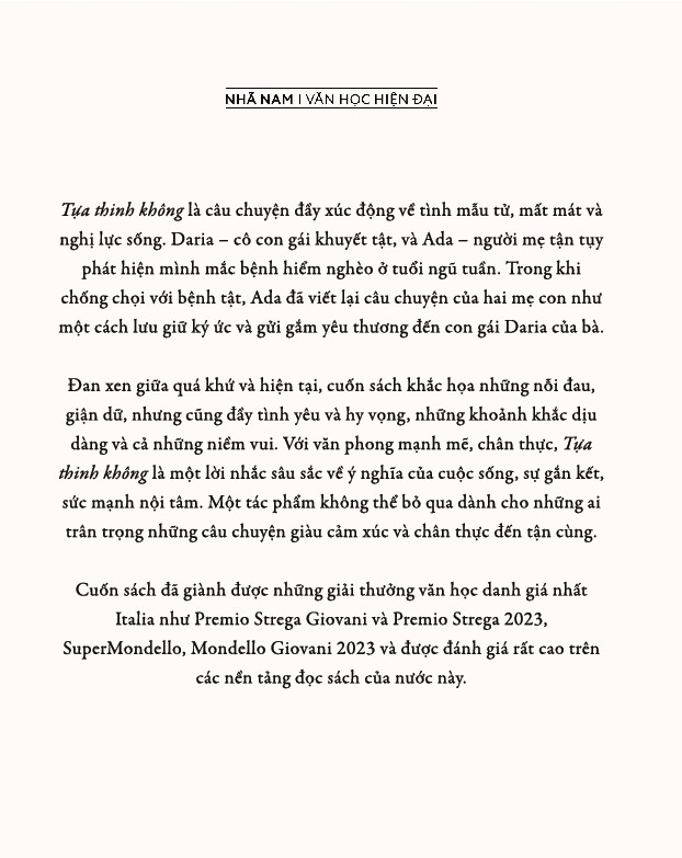 Tựa thinh không là câu chuyện đầy xúc động về tình mẫu tử, mất mát và nghị lực sống. Daria - cô con gái khuyết tật, và Ada - người mẹ tận tụy phát hiện mình mắc bệnh hiểm nghèo ở độ tuổi ngũ tuần. Trong khi chống chọi với bệnh tật, Ada đã viết lại câu chuyện của hai mẹ con như cách lưu giữ ký ức và gửi gắm yêu thương đến con gái Daria của bà.