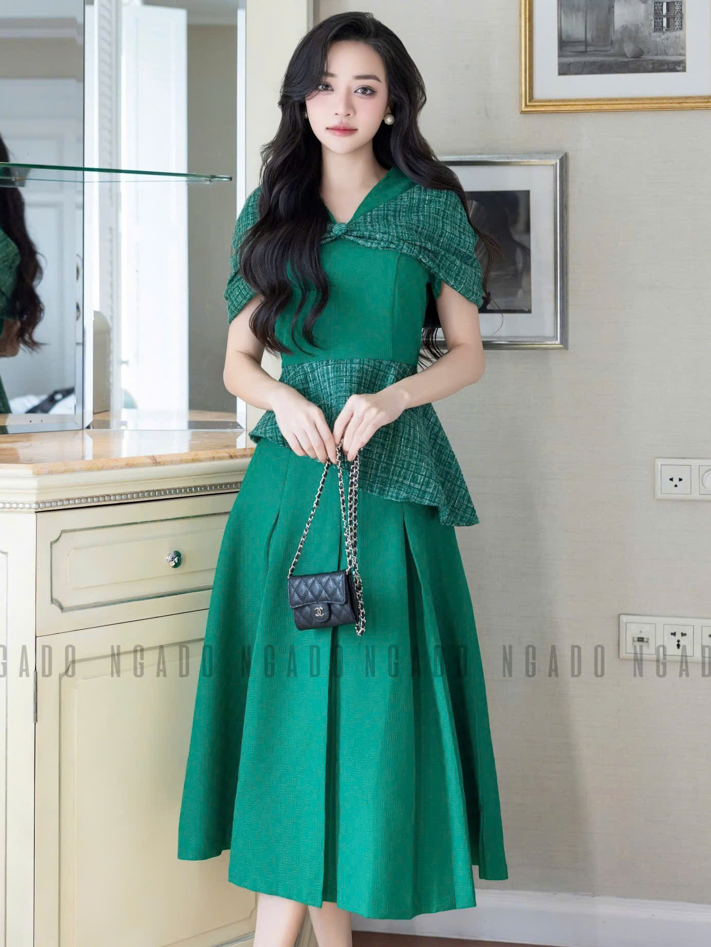 ✨Set áo váy xanh lá tay phối nơ NGADO , đầm dự tiệc , đầm thiết kế