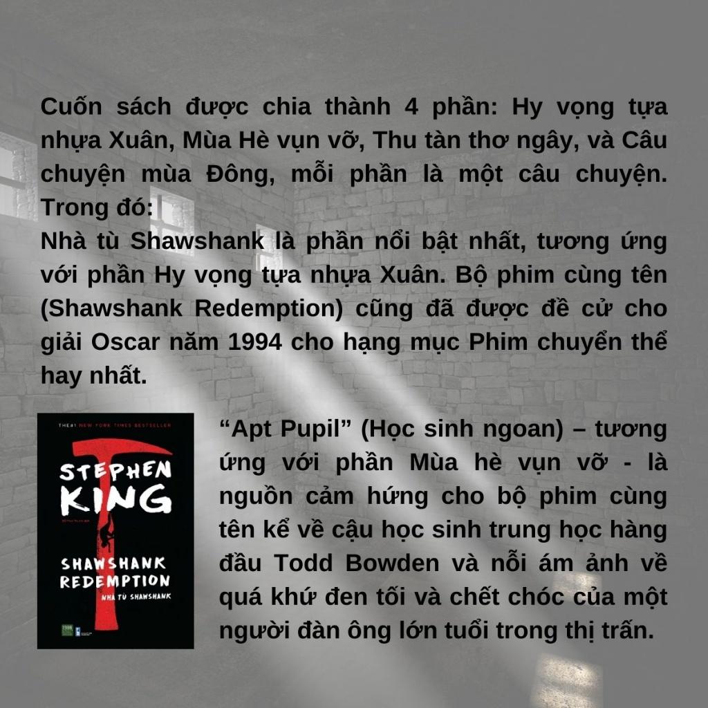 Truyện nói về Andy Dufresne một chủ ngân hàng bị kết án oan giết vợ phải ngồi tù chung thân tại nhà tù khét tiếng nhất bang là Shawshank. Khác hẳn với những con người đầu hàng số phận và sống buông xuôi tại những buồng giam, song sắt – Andy vẫn nuôi dưỡng kế hoạch vượt ngục trong mình. Trong suốt quá trình ở Shawshank, Andy chứng kiến sự tàn ác của cai ngục, của sự mất nhân tính và sự tha hóa của giám đốc nhà tù khi nhúng tay vào tham nhũng, bóc lột và giết chóc tù nhân. Tuy nhiên giữa những mặt tối ấy, tình bạn cao đẹp cũng như niềm tin vào số phận của Andy dành cho những con người anh yêu mến như Red, T bật lên như ngọn lửa le lói trong giông bão nhưng vô cùng mạnh mẽ đưa con người vực dậy từ cõi chết. Có thể đây là một tác phẩm ít máu me và cảm động nhất của Stephen King.
