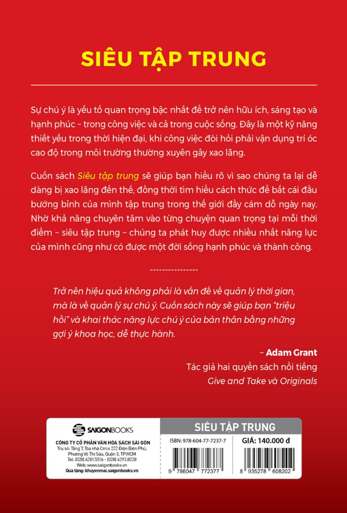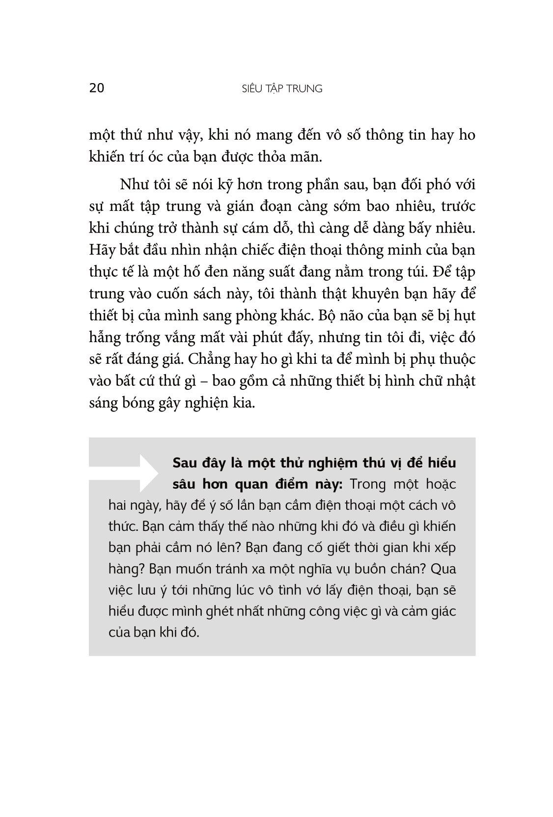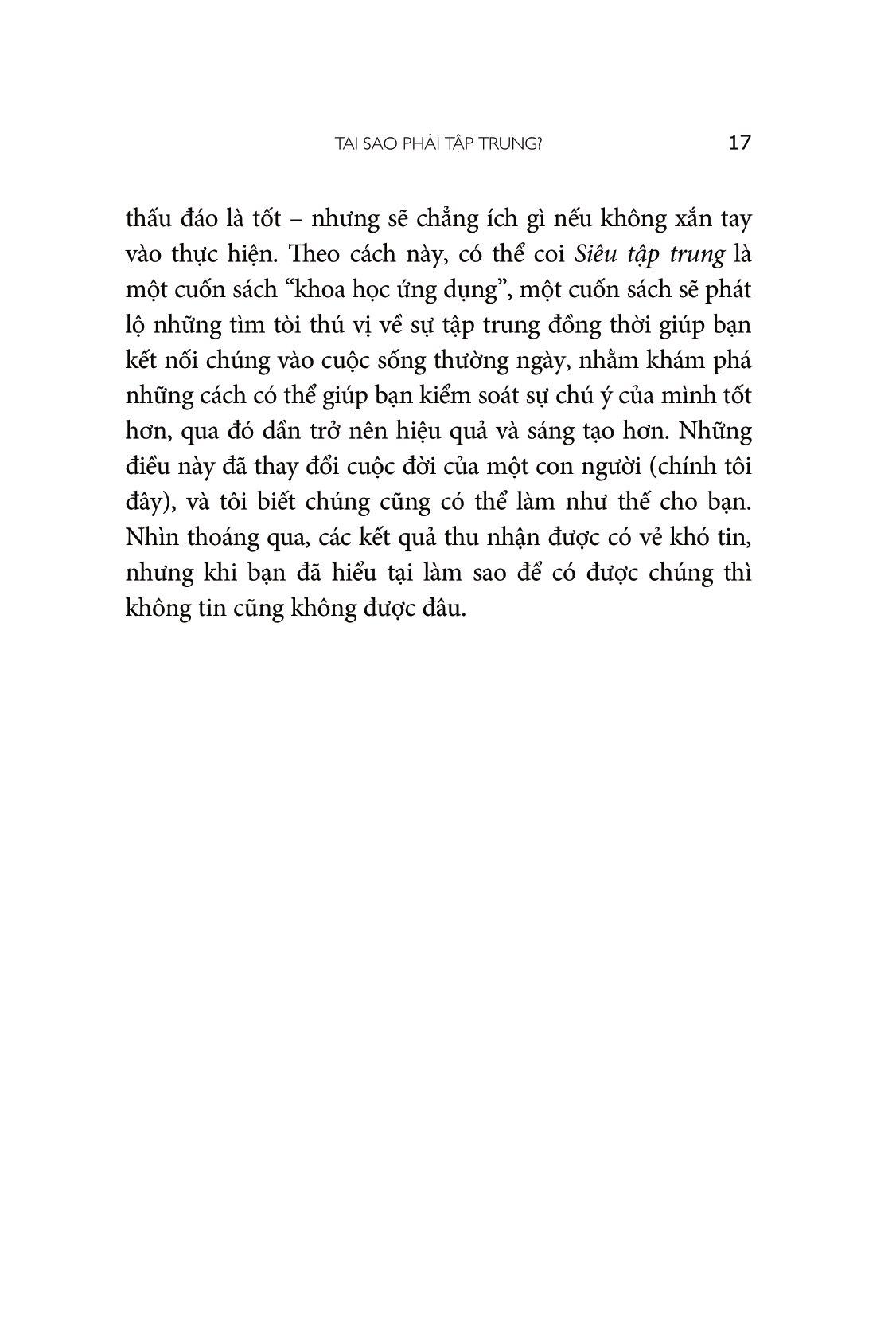 Có thể xem SIÊU TẬP TRUNG: Tăng hiệu quả trong một thế giới đa đoan là một cuốn sách “khoa học ứng dụng”, một cuốn sách sẽ phát lộ những tìm tòi thú vị về sự tập trung đồng thời giúp bạn kết nối chúng vào cuộc sống thường ngày, nhằm khám phá những cách có thể giúp bạn kiểm soát sự chú ý của m.ình tốt hơn, qua đó dần trở nên hiệu quả và sáng tạo hơn.