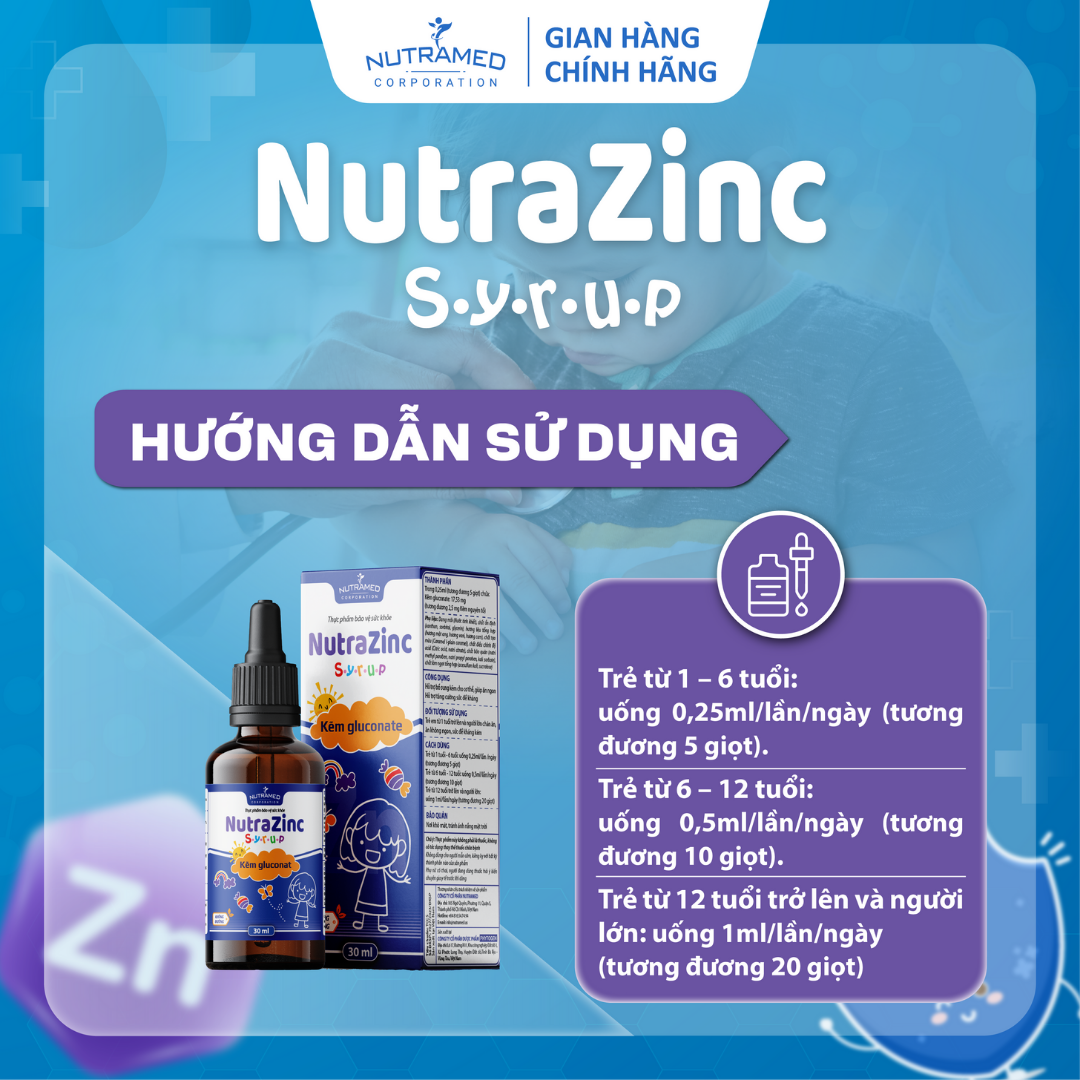 NUTRAZINC - Giải pháp hỗ trợ bổ sung kẽm, giúp ăn ngon và tăng cường sức đề kháng  THÀNH PHẦN  ️  Kẽm Gluconate  CÔNG DỤNG    ️  Hỗ trợ bổ sung kẽm cho cơ thể, giúp ăn ngon.  ️  Hỗ trợ tăng cường sức đề kháng.  ĐỐI TƯỢNG SỬ DỤNG  ️ Trẻ em từ 1 tuổi trở lên và người lớn chán ăn, ăn không ngon, sức đề kháng kém.  HƯỚNG DẪN SỬ DỤNG  ️  Trẻ từ 1 - 6 tuổi: uống 0,25ml/lần/ngày (tương đương 5 giọt).  ️  Trẻ từ 6 - 12 tuổi: uống 0,5ml/lần/ngày (tương đương 10 giọt).  ️  Trẻ từ 12 tuổi trở lên và người lớn: uống 1ml/lần/ngày (tương đương 20 giọt).  KHÔNG SỬ DỤNG TRONG TRƯỜNG HỢP  ️  Người mẫn cảm, kiêng kỵ với bất kỳ thành phần nào của sản phẩm. LƯU Ý  ️   Phụ nữ đang cho con bú, người đang dùng thuốc hỏi ý kiến chuyên gia y tế trước khi sử dụng.  ️   Thực phẩm này không phải là thuốc, không có tác dụng thay thế thuốc chữa bệnh. BẢO QUẢN   ️  Nơi khô mát, tránh ánh nắng trực tiếp.   ️  Tránh xa tầm tay trẻ nhỏ.  THÔNG TIN SẢN PHẨM Tên sản phẩm: NUTRAZINC Quy cách đóng gói: Hộp 1 lọ 30ml Hạn sử dụng: 36 tháng kể từ ngày sản xuất Đạt tiêu chuẩn TCCS _ NUTRAMED - KHƠI NGUỒN KHOA HỌC TỚI CUỘC SỐNG   Nhà máy đạt chuẩn WHO – GMP. Nguyên liệu được kiểm tra chất lượng khắt khe bởi nhà máy đạt chuẩn GMP.