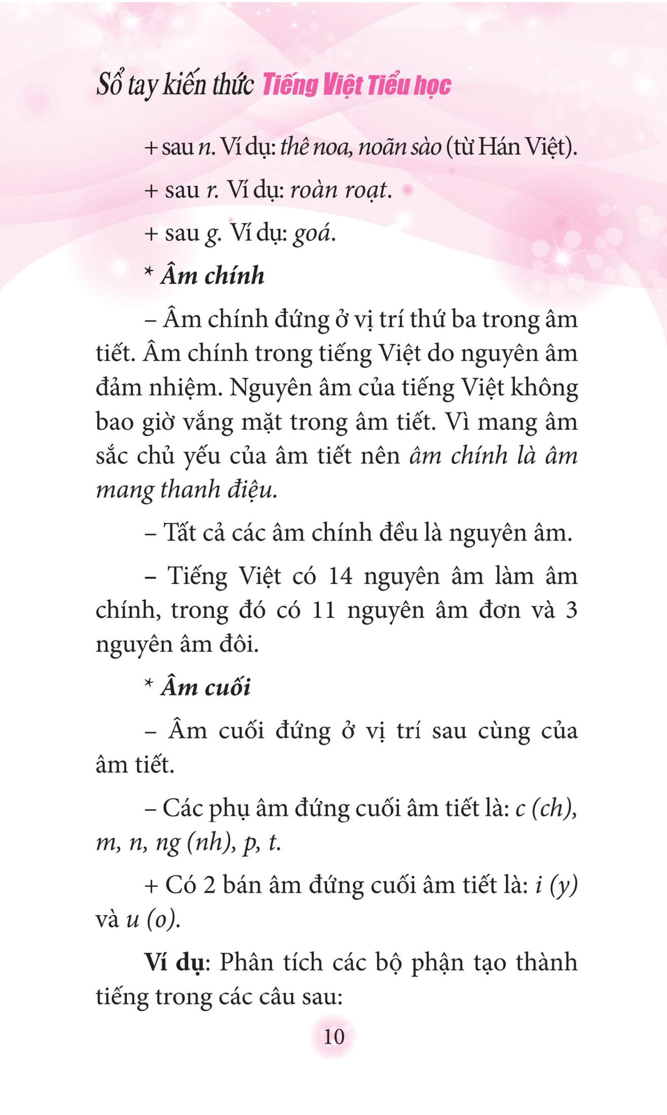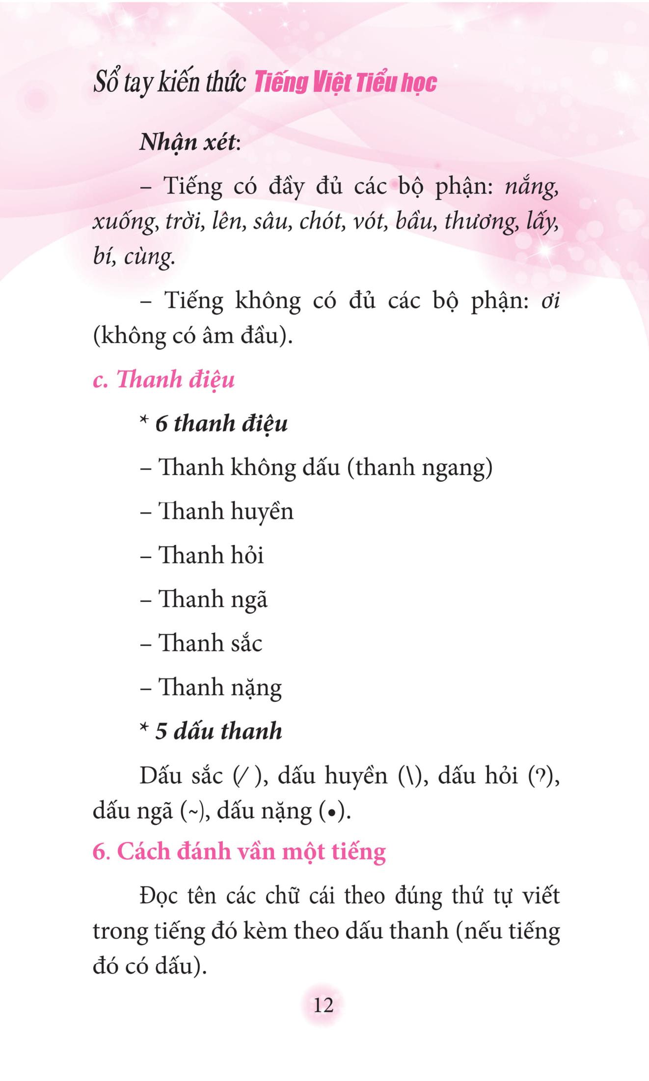 Cuốn Sổ tay kiến thức Tiếng Việt Tiểu học được biên soạn nhằm hệ thống lại toàn bộ những kiến thức tiếng Việt trong chương trình Tiểu học – 5 năm đầu của chương trình phổ thông.