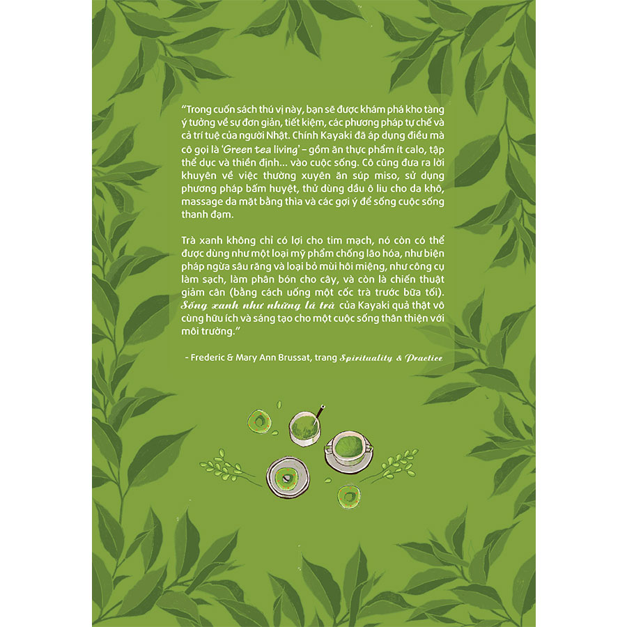 Trà xanh không chỉ có lợi cho tim mạch, nó còn có thể được dùng như một loại mỹ phẩm chống lão hóa, như biện pháp ngừa sâu răng và loại bỏ mùi hôi miệng, như công cụ làm sạch, làm phân bón cho cây, và còn là chiến thuật giảm cân (bằng cách uống một cốc trà trước bữa tối). Sống Xanh Như Những Lá Trà của Kayaki quả thật vô cùng hữu ích và sáng tạo cho một cuộc sống thân thiện với môi trường.