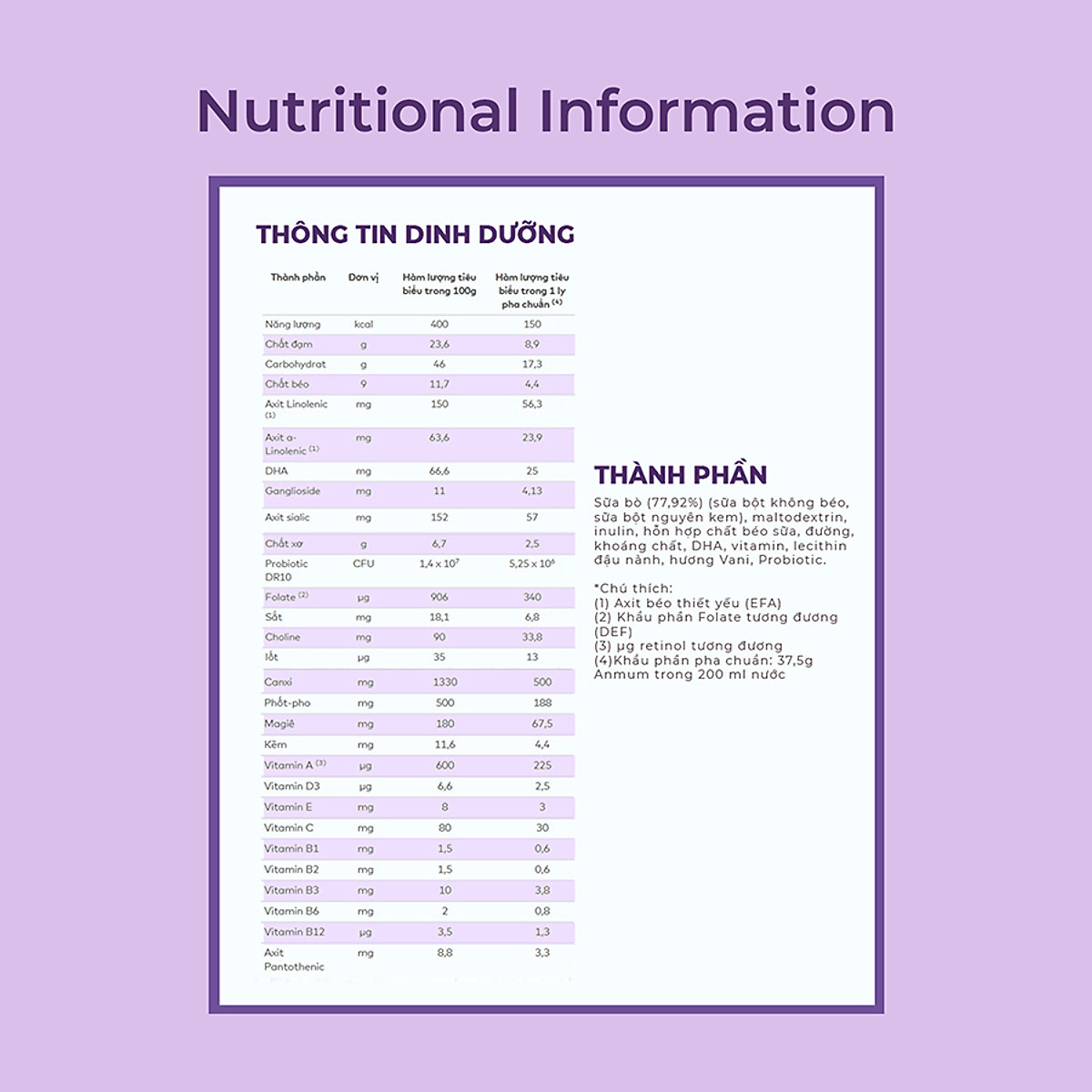 Sữa Bột Dành Cho Mẹ Bầu Anmum Materna Hương Vanilla 800g - Tặng Set 2 ly sứ Giới thiệu Anmum Materna hương vani là sữa bột dinh dưỡng tốt nhất dành cho phụ nữ mang thai và cho con bú. Với các dưỡng chất Mind-Q Nutrient Bundle, Anmum Materna là một trong những sản phẩm sữa tốt nhất hiện nay trên thị trường. Chỉ với 2 ly sữa bột Anmum Materna hương vani, nhu cầu Folate, Kẽm và Canxi mỗi ngày của bà bầu đã được đáp ứng đầy đủ. Trong khi Kẽm hỗ trợ trong việc duy trì sự trao đổi chất và chức năng thần kinh khỏe mạnh, thì Canxi củng cố răng và xương. Folate đóng một vai trò quan trọng trong việc phân chia tế bào lành mạnh ở cả mẹ và con, ngăn ngừa dị tật ống thần kinh ở trẻ sơ sinh. Thành phần Sữa bò (77,92%) (sữa bột không béo, sữa bột nguyên kem), maltodextrin, inulin, hỗn hợp chất béo sữa, đường, khoáng chất, DHA, vitamin, lecithin đậu nành, hương Vani, Probiotic. Đặc điểm nổi bật Sữa Anmum cho bà bầu là nguồn dinh dưỡng dồi dào cho cả mẹ và con. Chứa đầy DHA và GA, Anmum có hiệu quả cao trong việc phát triển trí não cũng như cơ thể của em bé. Nó cũng chứa sắt đóng vai trò trung tâm trong việc hình thành các tế bào hồng cầu, hỗ trợ cần thiết cho việc tăng 50% lượng máu trong thai kỳ. Ít chất béo, Anmum Materna hương vani là một trong những thức uống lành mạnh nhất cho phụ nữ mang thai và cho con bú. Sữa bột Anmum là loại sữa bột duy nhất dành cho bà bầu có chứa DR10. DR10 kết hợp với Inulin probiotic, cung cấp khả năng miễn dịch mạnh hơn và tiêu hóa khỏe mạnh. Ngoài ra sữa bột Anmun còn có dòng sữa bột Anmum Materna vị sô-cô-la thơm ngon. Công dụng Anmum Materna là sản phẩm đặc chế dành riêng cho phụ nữ mang thai và cho con bú giúp bổ sung dưỡng chất cần thiết cho mẹ bầu trong suốt thai kỳ. Hướng dẫn sử dụng Làm một ly sữa bổ dưỡng cho cả mẹ và bé chưa bao giờ đơn giản đến thế. Chỉ cần cho 4 muỗng (khoảng 42g) Sữa bột Anmum vào 1 ly (200ml) nước và khuấy đều. Bạn cũng có thể uống lạnh để tận hưởng hương vị của sữa. Thêm Anmum Materna vào chế độ ăn uống của phụ nữ mang thai làm tăng khả năng sinh thường và giúp ít biến chứng hơn. Nó cũng giúp giảm thiểu nguy cơ thai chết lưu, tử vong ở trẻ sơ sinh, bệnh tật và dị tật bẩm sinh. Hướng dẫn bảo quản Bảo quản nơi khô ráo. Luôn đậy kín sau khi sử dụng. Sử dụng trong vòng 1 tháng sau khi mở nắp hộp. Tiêu chuẩn an toàn Sản phẩm được sản xuất trên dây chuyền công nghệ hiện đại, đạt tiêu chuẩn chất lượng quốc tế. Lưu ý sử dụng Sản phẩm này không phải là thuốc và không có tác dụng thay thế thuốc chữa bệnh. Khuyến cáo Sữa mẹ là nguồn dinh dưỡng tốt nhất cho sự tăng trưởng và phát triển tối ưu của trẻ. Nó chứa một tỷ lệ thích hợp của tất cả các chất dinh dưỡng cần thiết để đáp ứng tổng nhu cầu dinh dưỡng của bé trong 6 tháng đầu tiên. Điều cực kỳ quan trọng đối với một bà mẹ cho con bú là có một chế độ ăn uống lành mạnh và cân bằng. Quyết định không cho trẻ bú mẹ hoặc cho trẻ bú bình một phần có thể tác động tiêu cực đến nguồn sữa mẹ và là một quyết định khó thay đổi. Vui lòng tham khảo ý kiến ​​chuyên gia chăm sóc sức khỏe của bạn để được tư vấn.