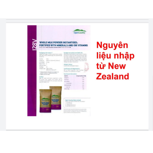 - Nguyên liệu thực phẩm: Sữa bột nguyên kem - Grand meadow - Instant whole milk power 28% - Milk fat 70% (Nguyên liệu nhập khẩu New Zealand), Bột kem béo (Nguyên liệu nhập khẩu