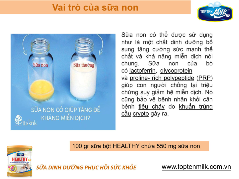 -Sữa HelThy, dành cho người mới ốm đậy, người ốm yếu, kén ăn, người bệnh ung thư chán ăn, vì có hàm lượng sữa non cao nên có thể dùng thay bữa phụ, đủ hàm lượng dinh dưỡng cho những người mệt mỏi sau ốm đậy người gầy, uống đều sẽ dễ ngủ, ngủ ngon, và có hàm lượng chất béo, tăng cân, kích thích ăn ngon miệng.