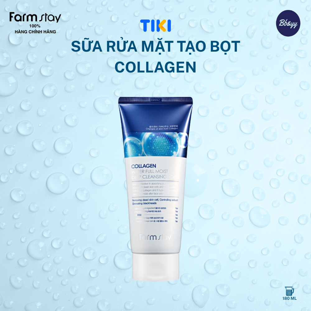 SỮA RỬA MẶT TẠO BỌT COLLAGEN _ COLLAGEN WATER FULL MOIST DEEP CLEANSING FOAM THÀNH PHẦN: xem trên bao bì sản phẩm. CÔNG DỤNG:    - Làm sạch nhẹ nhàng lớp trang điểm và các tác động bên ngoài suốt cả ngày với công nghệ ion âm.   - Giúp cân bằng độ pH da, giúp da ẩm mượt, dịu mát sau khi rửa mặt.   - Giúp da tẩy nhẹ TBC và bả nhờn sâu trong lỗ chân lông.   - Tăng cường dưỡng chất chống oxy hóa da và cải thiện nếp nhăn da. HƯỚNG DẪN SỬ DỤNG:    - Làm ướt mặt bằng nước sạch, lấy một lượng nhỏ sữa rửa mặt vào lòng bàn tay và tạo bọt sau đó nhẹ nhàng thoa và massage bọt lên mặt theo chuyển động tròn. Rửa mặt sạch lại bằng nước sạch. LƯU Ý KHI SỬ DỤNG:   - Khi sử dụng sản phẩm hoặc sau khi sử dụng, nếu vùng da sử dụng bị kích ứng hay tác dụng phụ do ánh nắng trực tiếp, hãy ngừng sử dụng và tham khảo ý kiến chuyên gia hoặc bác sĩ chuyên khoa.   - Không sử dụng trên vùng da bị thương và vết thương hở.   - Tránh xa tầm tay trẻ em vật nuôi và tránh ánh nắng trực tiếp lên sản phẩm.   - Sử dụng trong vòng 6 tháng sau khi mở nắp ( mở seal ) và đậy nắp kín sau khi sử dụng.   - Bảo quản sản phẩm ở nhiệt độ thường. Ngày SX & HSD: xem trên bao bì sản phẩm. Dung tích: 180ml. Nhà SX: Farmstay - Hàn Quốc. Nhà NK & PP: Công Ty TNHH BB&YY ( Beauty and Young). SCB: 239809/24/CBMP-QLD.