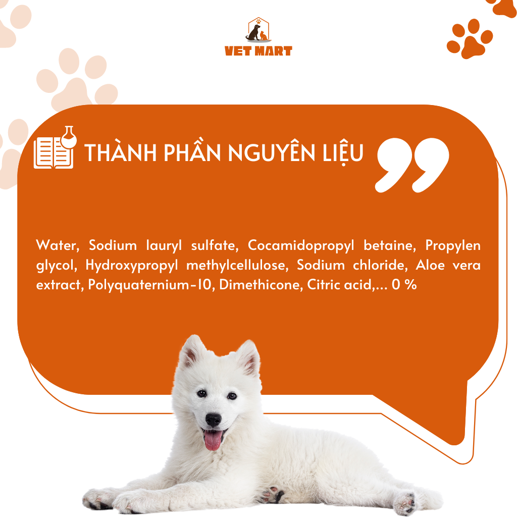 - Sữa tắm Charmie hương ngọc lan tây có thể dùng cho chó, mèo mọi màu lông. ️THÀNH PHẦN: Water, Sodium lauryl sulfate, Cocamidopropyl betaine, Propylen glycol, Hydroxypropyl methylcellulose, Sodium chloride, Aloe vera extract, Polyquaternium-10, Dimethicone, Citric acid,... 0 % ️CÁCH DÙNG: -Làm ướt toàn bộ lông thú cưng bằng nước có nhiệt độ thích hợp, lấy 1 phần sữa tắm vừa đủ rồi xoa đều khắp mình thú cưng. -Gãi hoặc cào nhẹ, massage cho thú cưng khoảng 5-10 phút để sữa tắm thấm đều khắp cơ thể, sau đó tắm lại bằng nước sạch. -Dùng khăn bông khô lau sạch nước cho thú cưng. Có thể dùng máy sấy để sấy trường hợp thời tiết lạnh hoặc bộ lông quá dày và dài.
