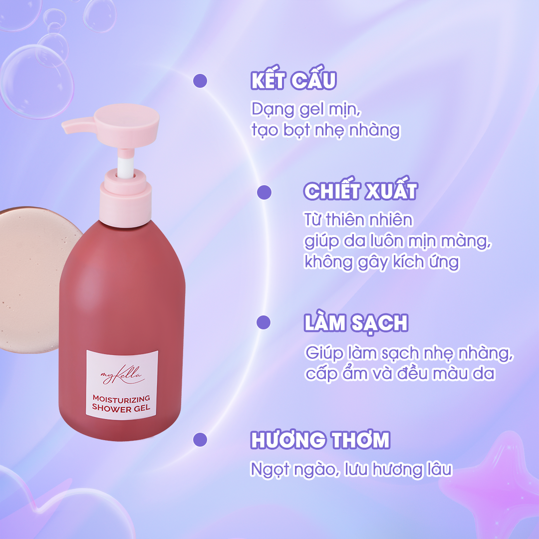 THÔNG TIN SẢN PHẨM Sữa tắm dưỡng ẩm Moisturizing Shower Gel từ myKella là dòng sữa tắm dưỡng da với công thức hiện đại, giúp làm sạch, dưỡng ẩm và nâng tone da một cách tự nhiên. Nhờ chiết xuất từ dầu Inca Inchi cùng các thành phần thiên nhiên, sản phẩm giúp làn da luôn mềm mại, mịn màng và căng tràn sức sống. Hương thơm dịu nhẹ, sang trọng của sữa tắm hương nước hoa mang lại cảm giác thư giãn đầy quyến rũ. THÔNG SỐ KỸ THUẬT