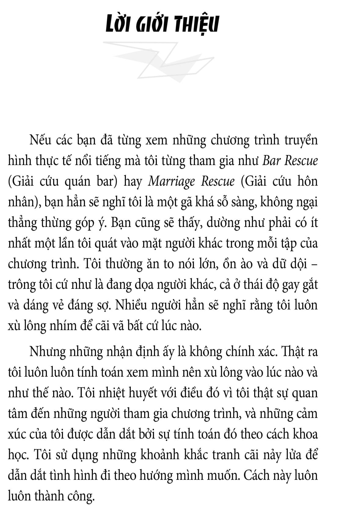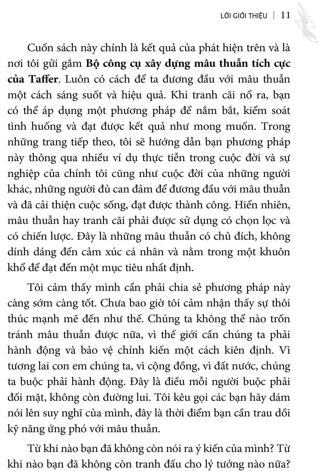 Thông qua bộ công cụ xây dựng mâu thuẫn tích cực của Taffer. cuốn sách này là nỗ lực của tác giả gửi gắm đến cho bạn một số cách tiếp cận mâu thuẫn có chiến lược – làm thế nào để bạn chủ động đối mặt chứ không còn bị động phản ứng nữa. Để tận dụng được sức mạnh của mâu thuẫn một cách chủ động, hiệu quả và có tính xây dựng.