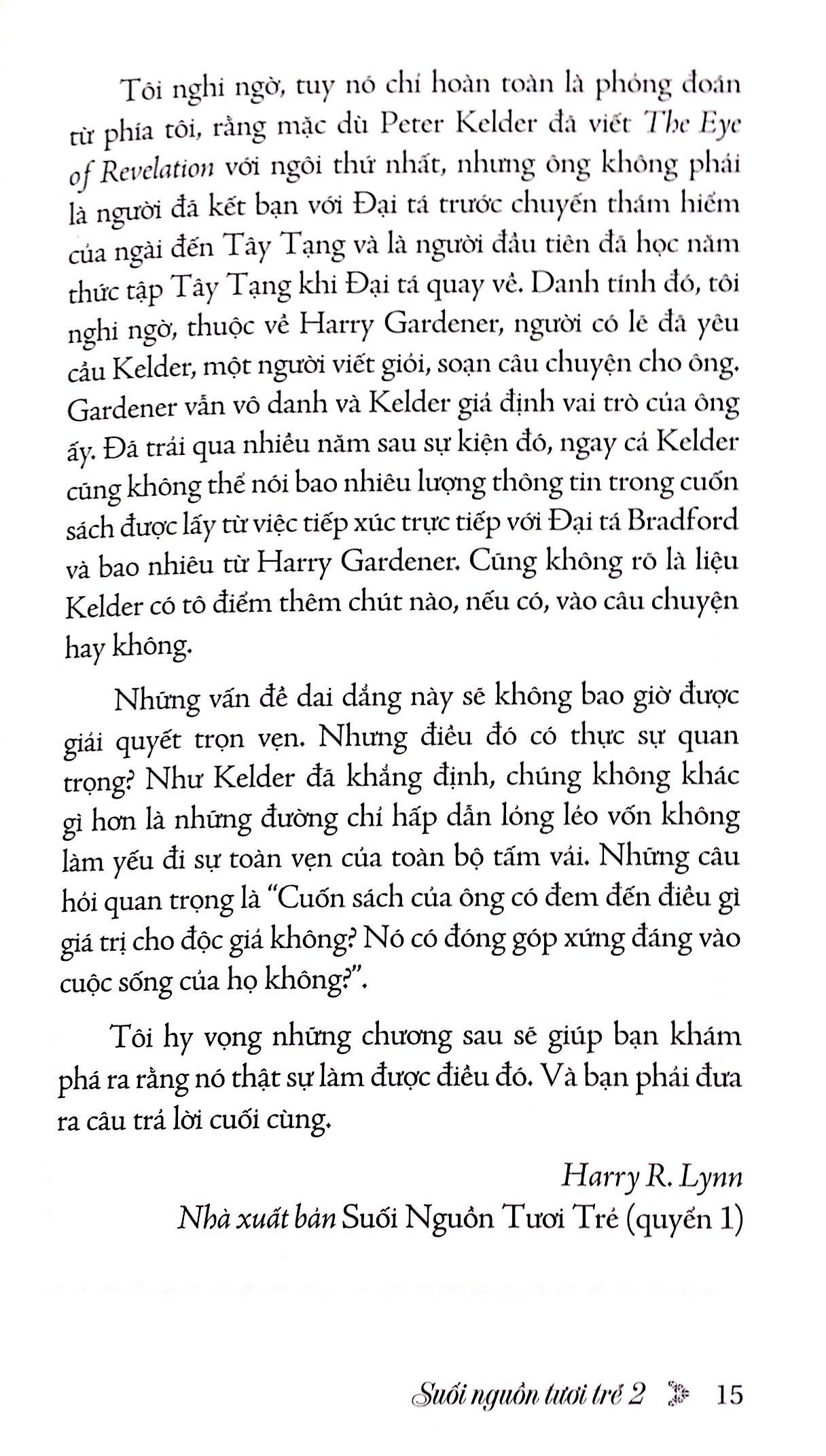 Nếu như Suối nguồn tươi trẻ 1 của tác giả Peter Kelder mở ra cho công chúng một thế giới Tây Tạng không phải với các huyền thuật kì bí mà là những phương thức cụ thể để đạt đến sự “trẻ hóa”, thì Suối Nguồn Tươi Trẻ 2 ra đời dựa trên những câu chuyện có thật, những trải nghiệm của chính người trong cuộc.