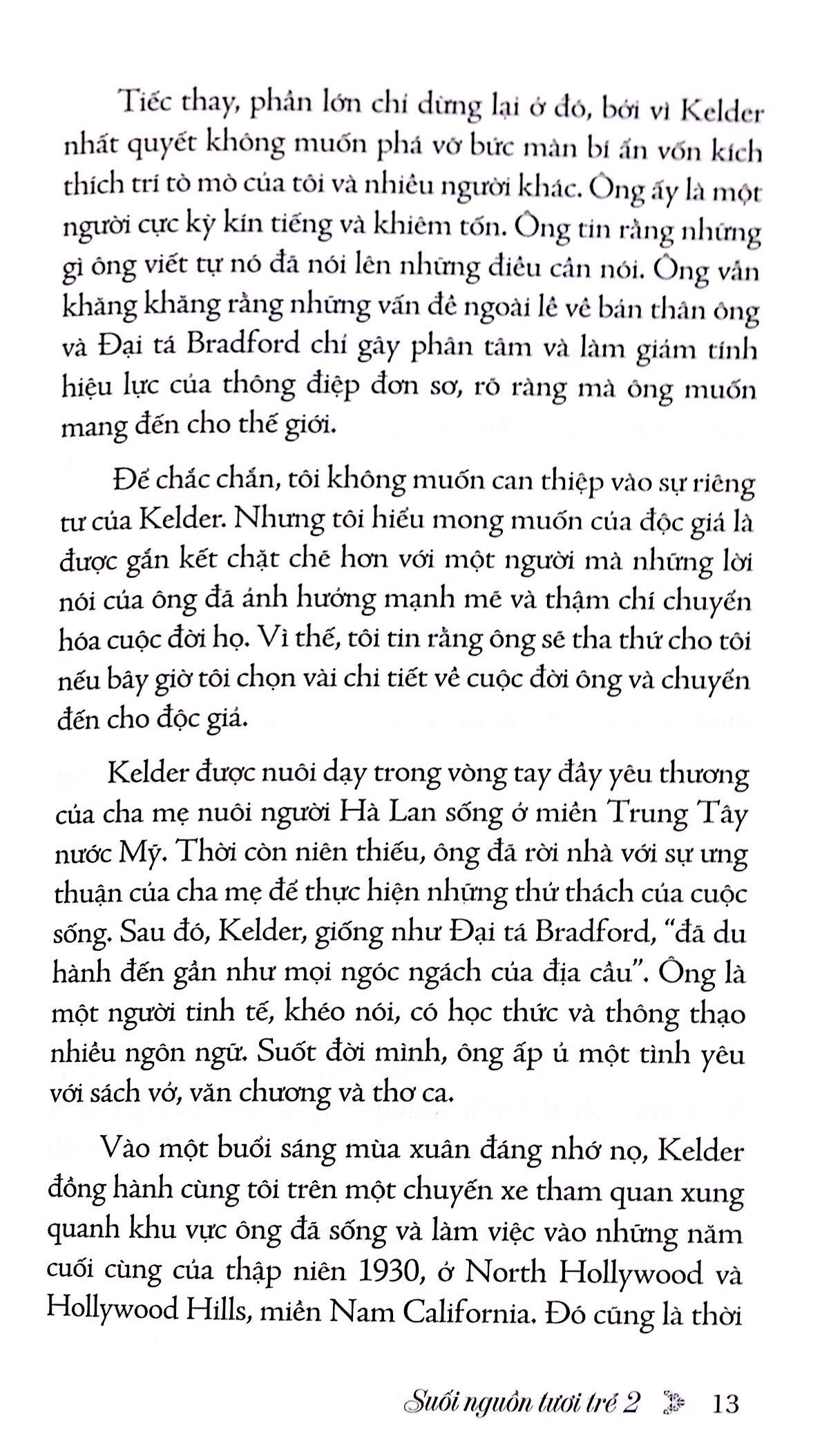 Suối Nguồn Tươi Trẻ 2 chứa một lượng thông tin phong phú bổ sung cho cuốn sách của Kelder – Suối Nguồn Tươi Trẻ1. Mỗi chương được viết bởi một chuyên gia về chủ đề đó. Cuốn sách không thực sự nói về những nghi thức, bài tập hay các kỹ thuật. Cốt lõi của nó là về chúng ta – thái độ, niềm tin của bạn; sự khát khao, hy vọng và tiềm năng của bạn; cũng như khả năng đón nhận cuộc sống một cách vui sướng và sống một cách trọn vẹn.