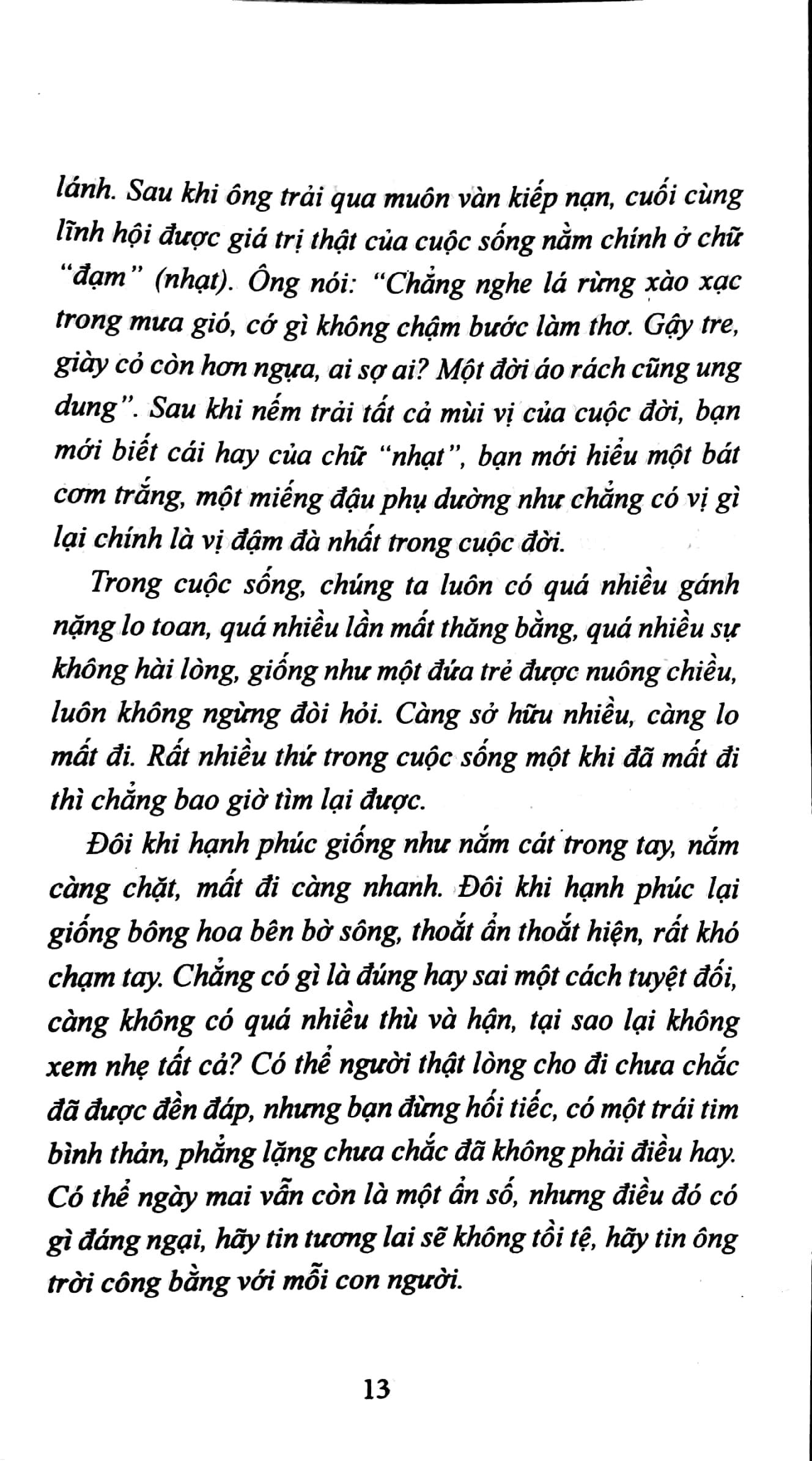 Đó chính là điều mà cuốn sách muốn gửi đến bạn đọc, để chúng ta sống chậm lại trong thế giới phức tạp, náo nhiệt và có phần thiên về vật chất hiện nay.