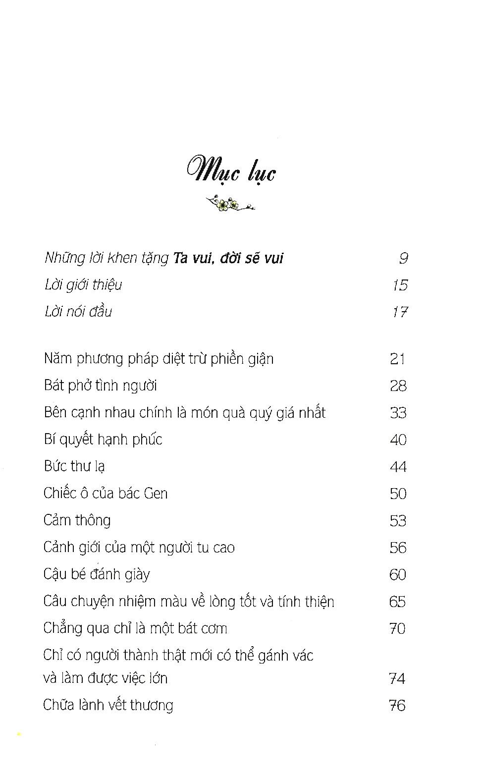 Mong rằng với “Ta vui đời sẽ vui”, mầm yêu thương, thiện lành và niềm hy vọng sẽ tràn ngập trong trái tim mỗi bạn đọc. Và hãy để nguồn năng lượng đó trở thành người bạn đồng hành của bạn trên hành trình tìm về với chính mình, để có được niềm vui, niềm hạnh phúc và bình an trong từng phút giây của cuộc đời.