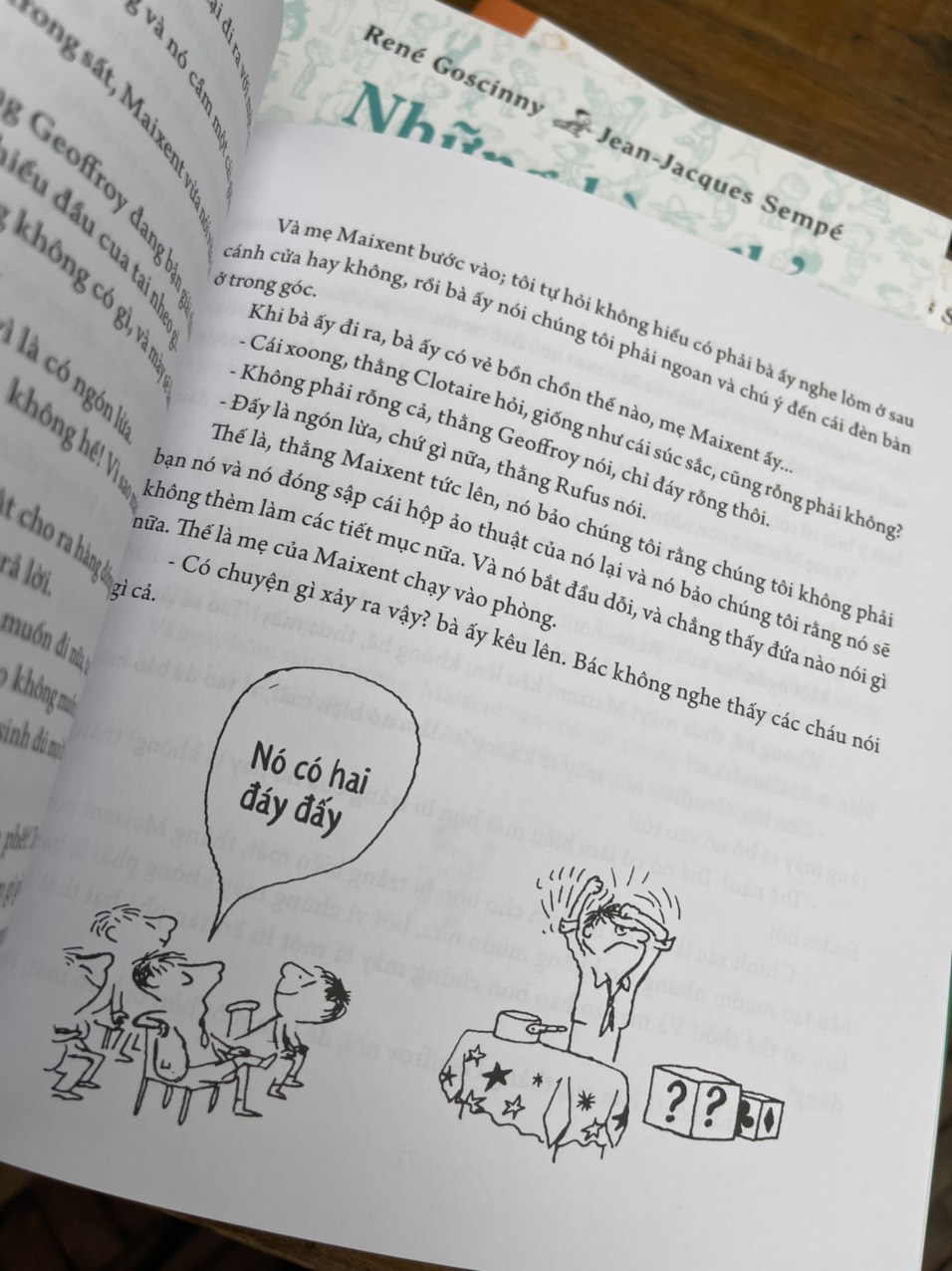 “‘Có ai không hả, Joachim?’ thẳng Clotaire hỏi. Joachim trả lời rằng nó không nhìn thấy gì cả. Vậy là Clotaire đứng lên và nói nó sẽ lên bắt thằng Agnan phải ăn quyển sách số học của nó, thật là một ý tưởng kỳ lạ, nhưng thẳng Agnan thì chẳng thích tẹo nào liền hét lên: ‘Không! Tao còn có kính đây! - Mày sẽ ăn cả kính nữa! Clotaire nói, cái thẳng đã kiên quyết cứ muốn Agnan phải ăn một cái gì đó.”