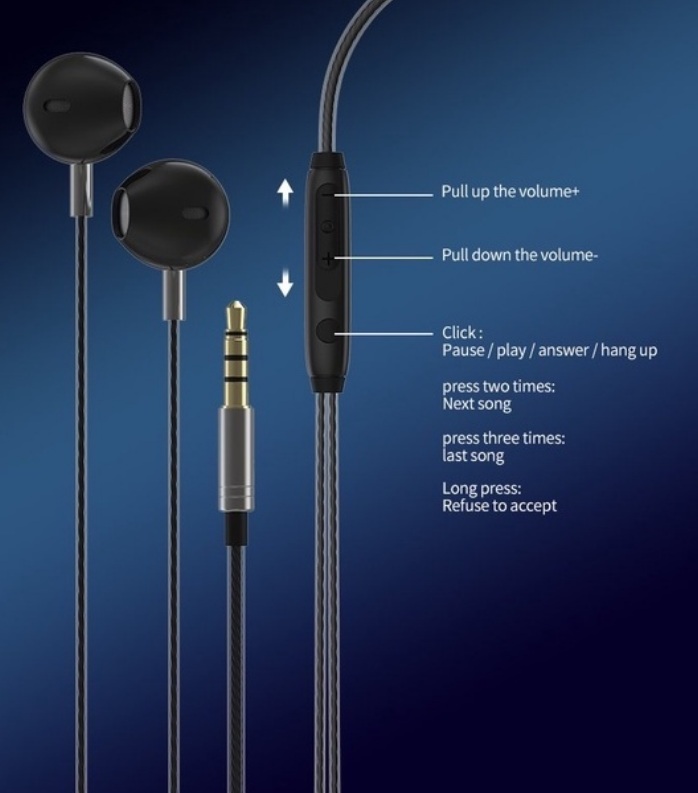Tai nghe phổ thông âm nhạc M34 Honor với đầu nối giắc cắm micrô 3,5 mm Cáp 1,2m với bộ điều khiển tai nghe có dây 1. Loa ngoài: 10mm. 2. Trở kháng: 16Ω ±