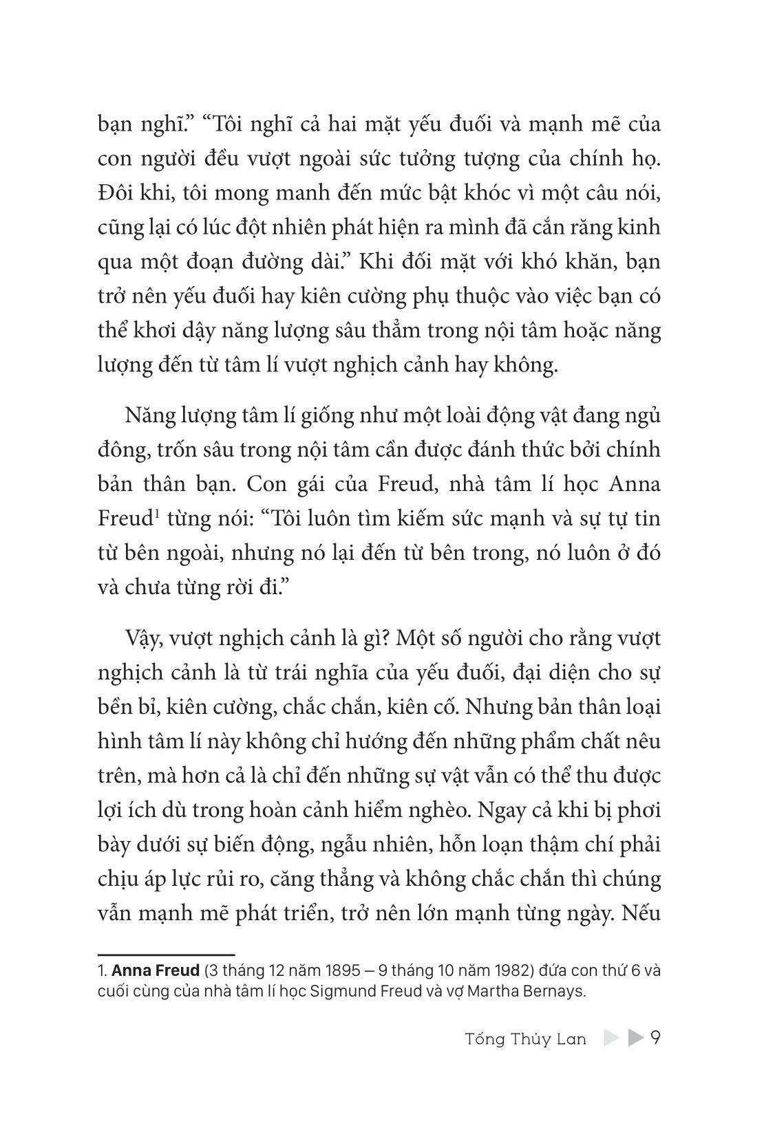 Năng lực vượt nghịch cảnh là một khái niệm vượt ra ngoài khả năng phục hồi và khả năng chịu đựng bền bỉ. Còn tâm lí vượt nghịch cảnh lại đi xa hơn khả năng phục hồi, nó khiến mọi vật giữ tốc độ tăng trưởng ngay cả trong hoàn cảnh ngặt nghèo nhất. Chỉ khi sở hữu năng lực vượt nghịch cảnh, thì con người ta mới có thể thực sự đạt đến trạng thái không sợ hãi bất cứ điều gì, mới có thể sống thoải mái tự tại, bình tĩnh ứng phó với mọi hoàn cảnh vinh nhục. Theo tác giả, để xây dựng sức mạnh bên trong, bạn phải học ba điều này: