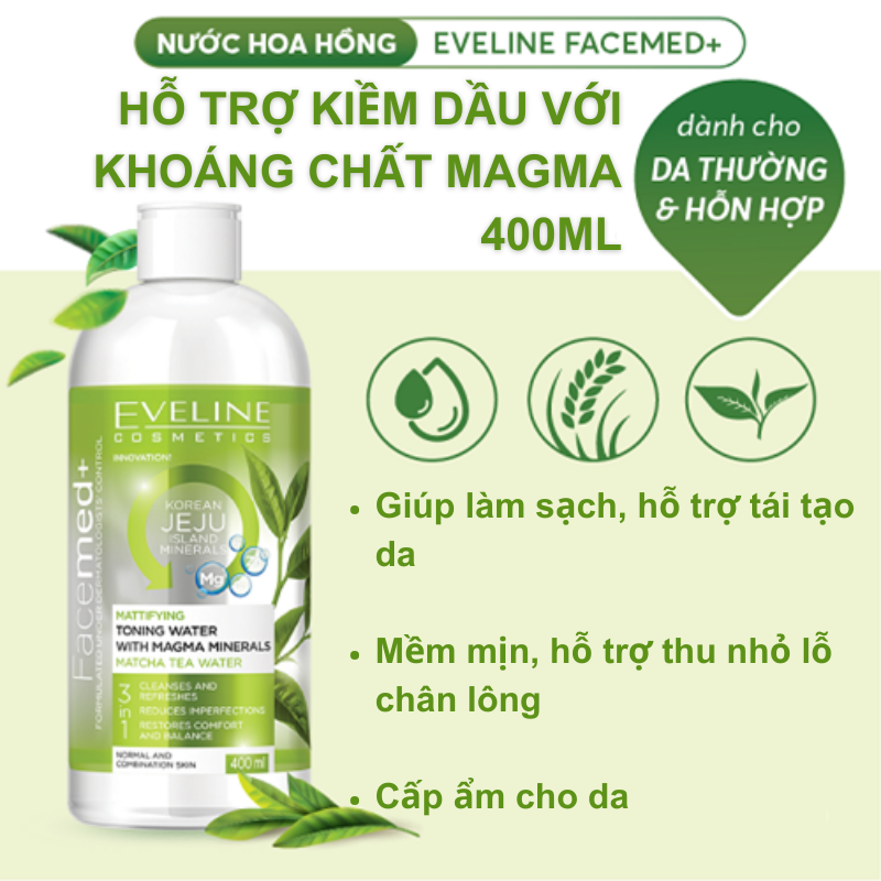 - Toner Eveline Facemed+ kiềm dầu với khoáng chất Magma 400ML với công thức độc đáo được kiểm soát bởi các bác sĩ da liễu có tác dụng làm sạch và làm dịu da kích ứng, phục hồi độ ẩm và độ pH tự nhiên của da, tái tạo lớp biểu bì giúp da mềm mịn, căng bóng. HDSD: