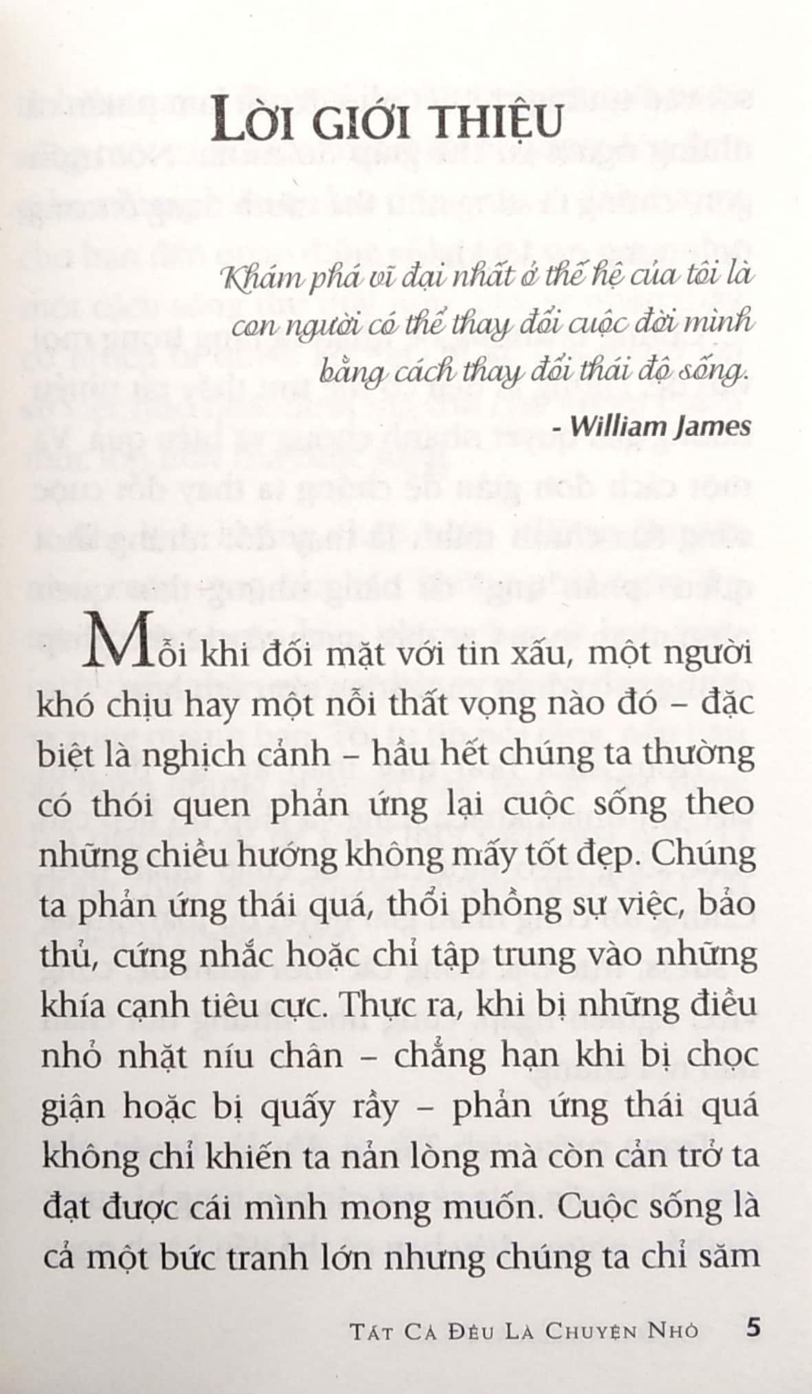 Thực ra, khi bị những điều nhỏ nhặt níu chân - chẳng hạn khi bị chọc giận hoặc bị quấy rầy - phản ứng thái quá không chỉ khiến ta nản lòng mà còn cản trở ta đạt được cái mình mong muốn. Cuộc sống là cả một bức tranh lớn nhưng chúng ta chỉ săm soi vào những chi tiết nhỏ để rồi làm phiền cả những người có thể giúp đỡ mình. Nói ngắn gọn, chúng ta sống như thể mình đang ở trong tình trạng cực kỳ khẩn cấp! Chúng ta không hề nhận ra rằng trong mọi vấn đề, chúng ta đều có thể tìm thấy rất nhiều hướng giải quyết nhanh chóng và hiệu quả. Và một cách đơn giản để chúng ta thay đổi cuộc sống của chính mình là thay đổi những thói quen “phản ứng” cũ bằng những thói quen nhìn nhận mới. Các thói quen này sẽ cho phép chúng ta có được cuộc sống trọn vẹn hơn sau khi đã giải quyết đủ loại vấn đề - stress, trục trặc trong các mối quan hệ, công việc, cũng như những nỗi chán nản nói chung.