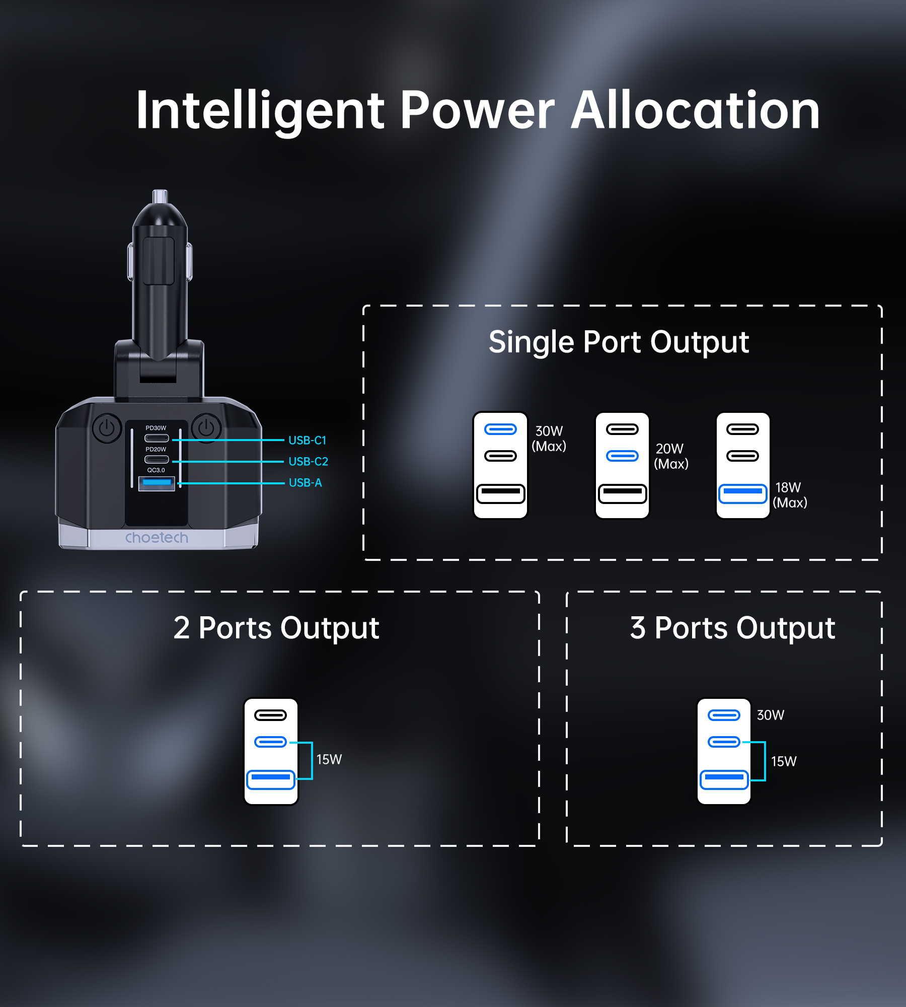 - Thương hiệu: Choetech - Model: TC0030 - Công suất: 65W - Input: DC12-24V-7A Max - Output: - Type-C1: 5V/3A, 9V/3A,12V/2.92A,15V/2.33A, 20V/1.75A, - PPS: 3.3-11V/3A - Type-C2 Cable: DC5V/3A, 9V/3A,12V/2.5A,15V/2A, 20V/1.5A - PPS: 3.3-11V/3A - USB-A: 5V/3A, 9V/3A,10V/2.25A,12V/2.5A 30W - A+C together: 5V3A - Kích