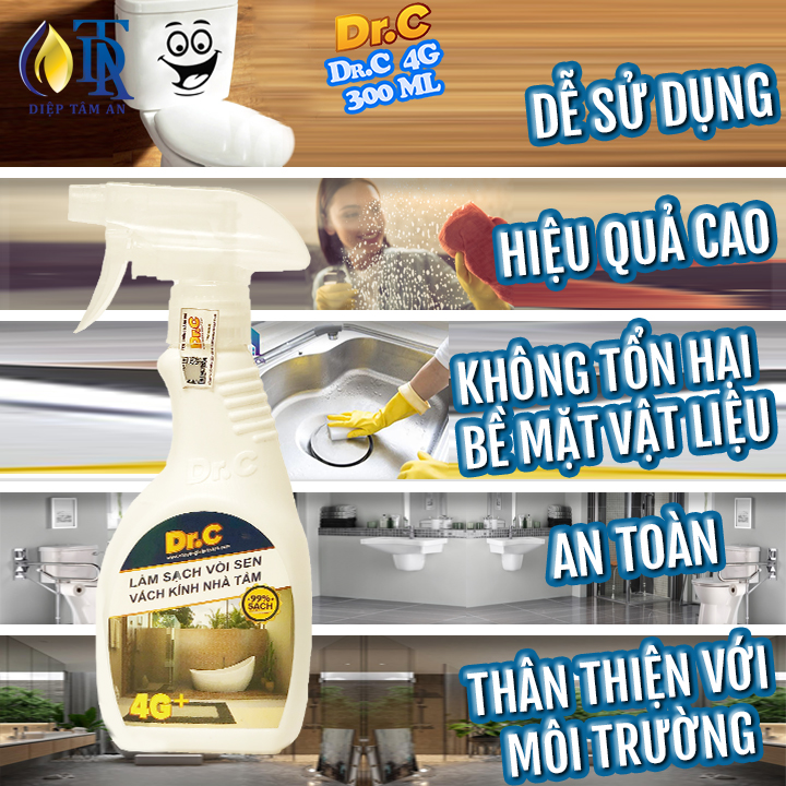 CÔNG DỤNG:Tẩy Cặn Canxi Nhà Tắm,Tẩy Vách Kính Vòi Sen Inox,Tẩy Ố Vàng Nhà Vệ Sinh Lavabo,Tẩy Rỉ Sét Inox-4G Dr.C 300ml: