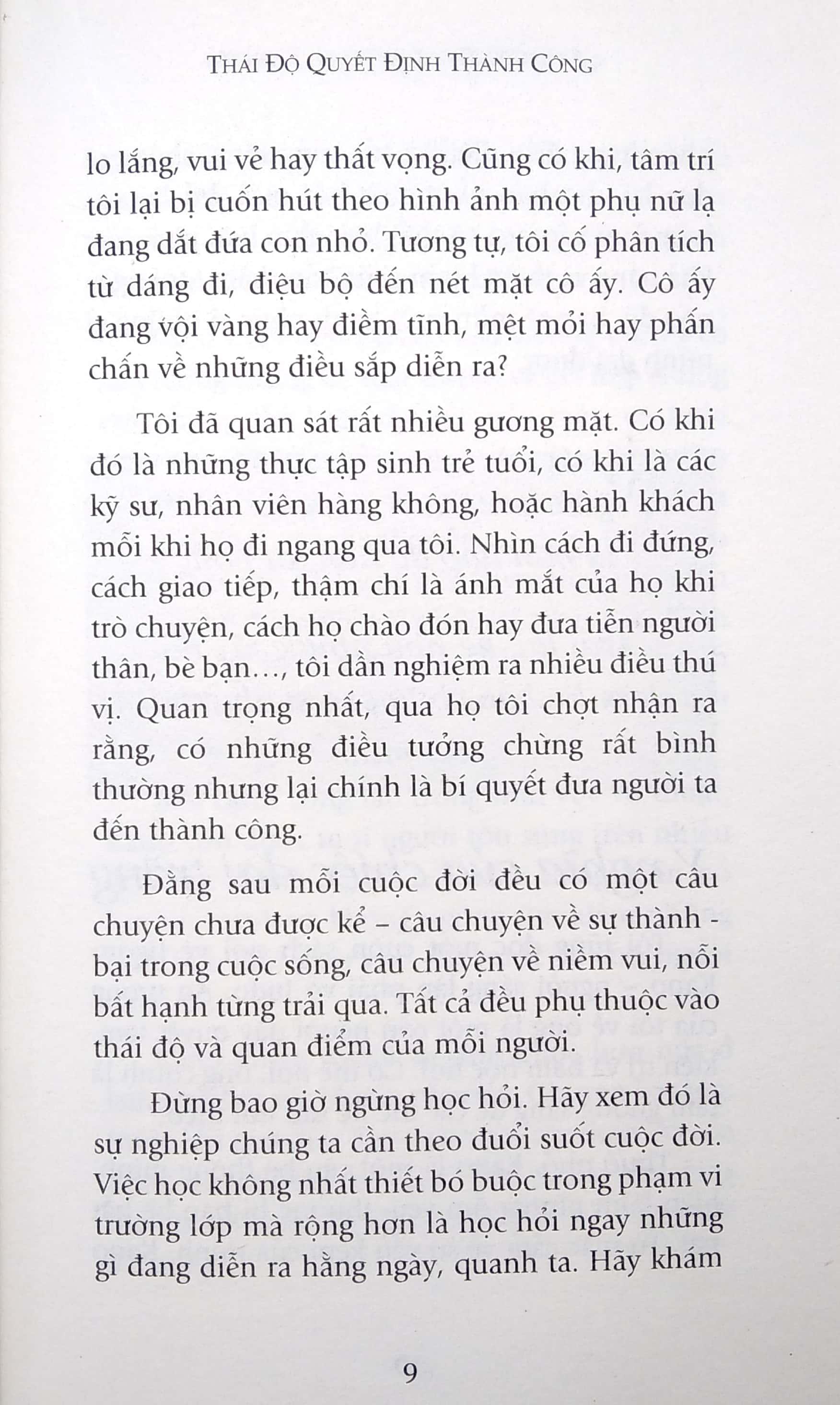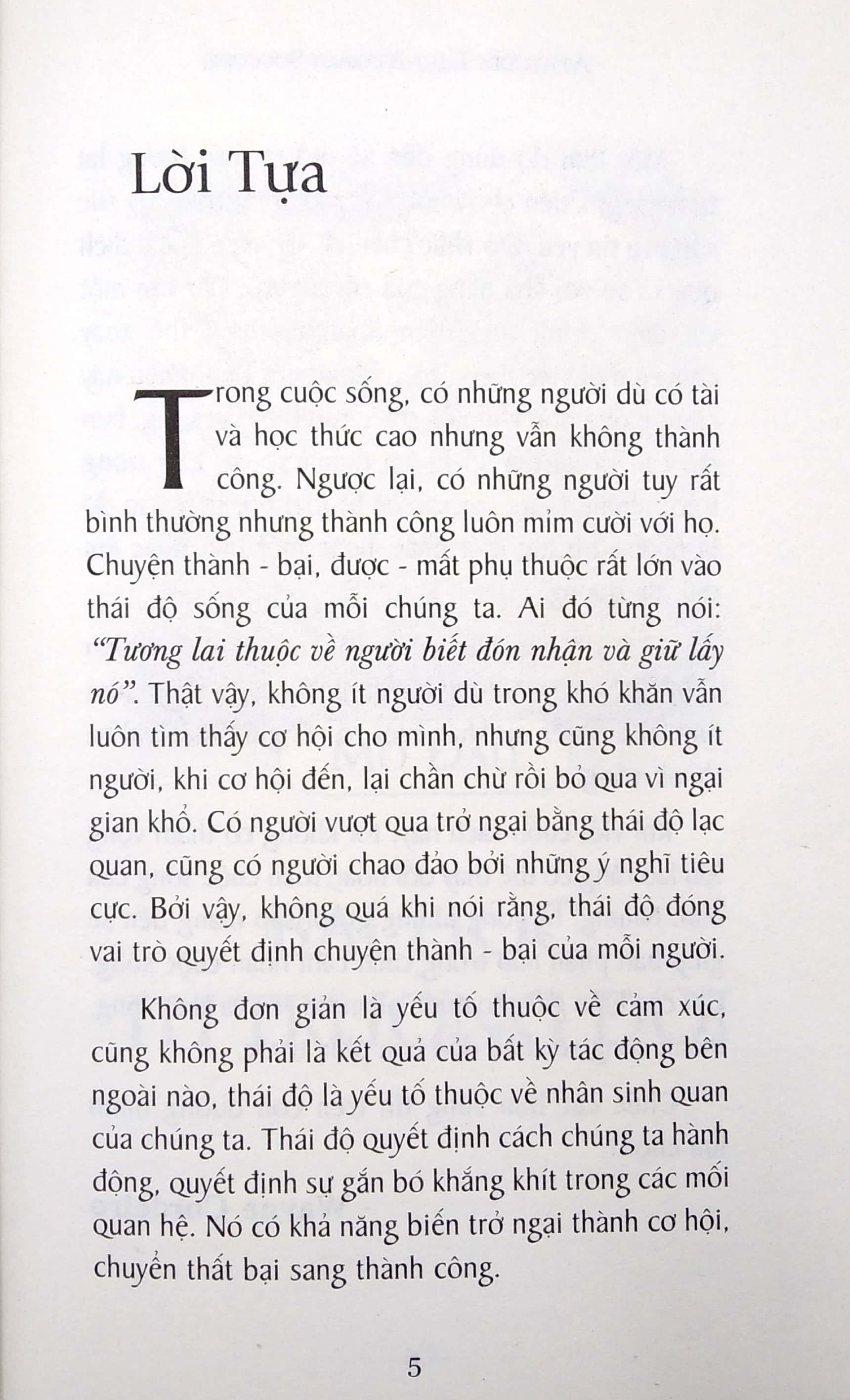 Một thái độ đúng đắn sẽ mở ra một tương lại tươi sáng, khiến cho cuộc sống hiện tại tràn đầy sức sống và tin yêu. Đó chắc chắn không phải là cái đích quá xa so với khả năng của con người. Chỉ cần một vài điều chỉnh nhỏ, bạn hoàn toàn có thể xoay chuyển mọi việc theo chiều hướng tốt đẹp. Điều này cũng giống như khi một chiếc radio bị lạc sóng, bạn chỉ cần rà lại tần số là âm thanh sẽ trở nên trong trẻo; những tiếng lạo xạo sẽ bị loại bỏ, thay vào đó là những tin tức mới nhất, hoặc một bản nhạc êm dịu, du dương.