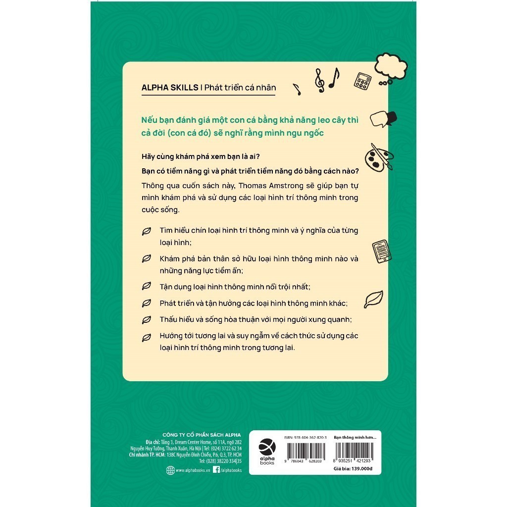 Những điều này có thể khiến bạn ngạc nhiên bởi trí thông minh có thể biểu hiện theo nhiều cách thức khác nhau – trong nghệ thuật, âm nhạc, thể thao, trong cách cảm nhận, sự hiểu biết về thiên nhiên và sống hòa hợp với những người xung Bạn thông minh hơn bạn nghĩ sẽ giúp bạn khám phá ra rằng có vô vàn cách biểu hiện trí thông minh.