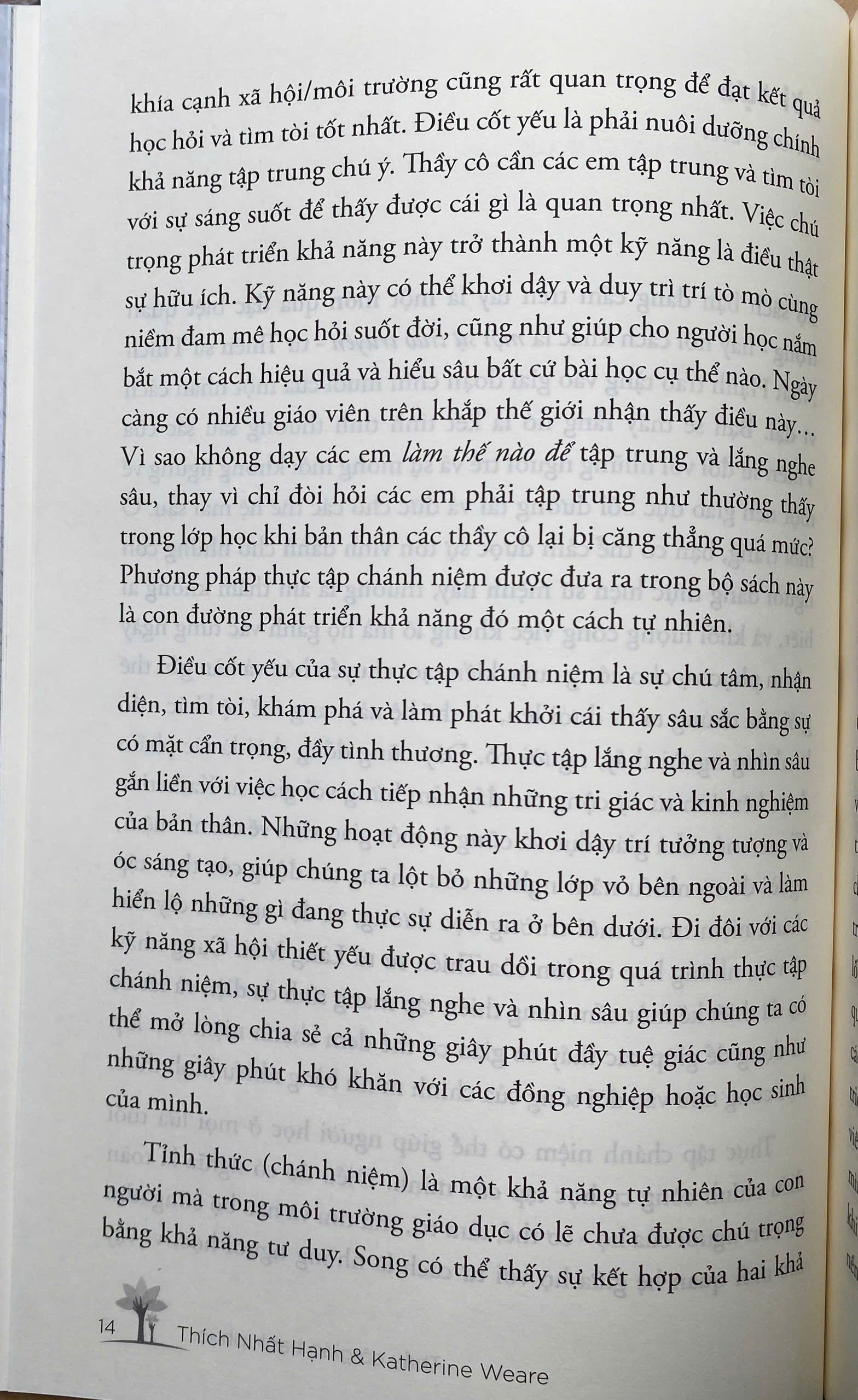 Đánh thức khả năng sáng tạo và trí tưởng tượng của bản thân trong suốt cuộc đời theo cách thức này là một yếu tố quan trọng dẫn tới thành công và hạnh phúc như tiêu đề của bộ sách. Một trong những nguyên tắc chính ở đây là các thầy cô giáo cần thực tập chánh niệm trong đời sống của chính mình trước khi có thể đưa nó vào lớp học một cách hiệu quả. Nếu bạn làm nghề giáo và mới biết đến phương pháp chánh niệm, bộ sách này sẽ hướng dẫn hết sức chi tiết cách bạn thực tập cho chính mình, cũng như cách bạn có thể đưa nó vào lớp học theo cách riêng của mình để giúp học sinh phát triển lành mạnh về thể chất và tinh thần, biết cách chăm sóc cảm xúc và có niềm vui trong khi học. Cần lưu ý rằng không có một phương pháp nào là phù hợp cho mọi hoàn cảnh. Cái hay của cách nhìn này là cho bạn một loạt các lựa chọn để thử nghiệm và trên hết là nhắc bạn nhớ rằng chính sự sáng tạo của riêng bạn, được nuôi dưỡng bởi sự thực tập chánh niệm, sẽ mang đến muôn vàn những cơ hội mới và đầy thú vị. Nói một cách thực tế thì học trò của bạn sẽ là người giúp khơi mở nguồn tuệ giác đó trong bạn. Các em chính là những người thầy chánh niệm vĩ đại nhất của bạn. Điểm hay của phương thức tiếp cận này là nó có thể bắt nguồn từ tình yêu nghề và tấm lòng mong mỏi học trò tiến bộ, được ấp ủ và truyền đạt bởi chính trực giác và kinh nghiệm thực tiễn của bạn; tất cả những điều này đều dựa vào công phu thực tập trong từng thời khắc của bạn. Theo như tôi nghiệm thấy, những băn khoăn, học hỏi, quán chiếu cứ lớn lên không ngừng trên mảnh đất nuôi dưỡng ấy.