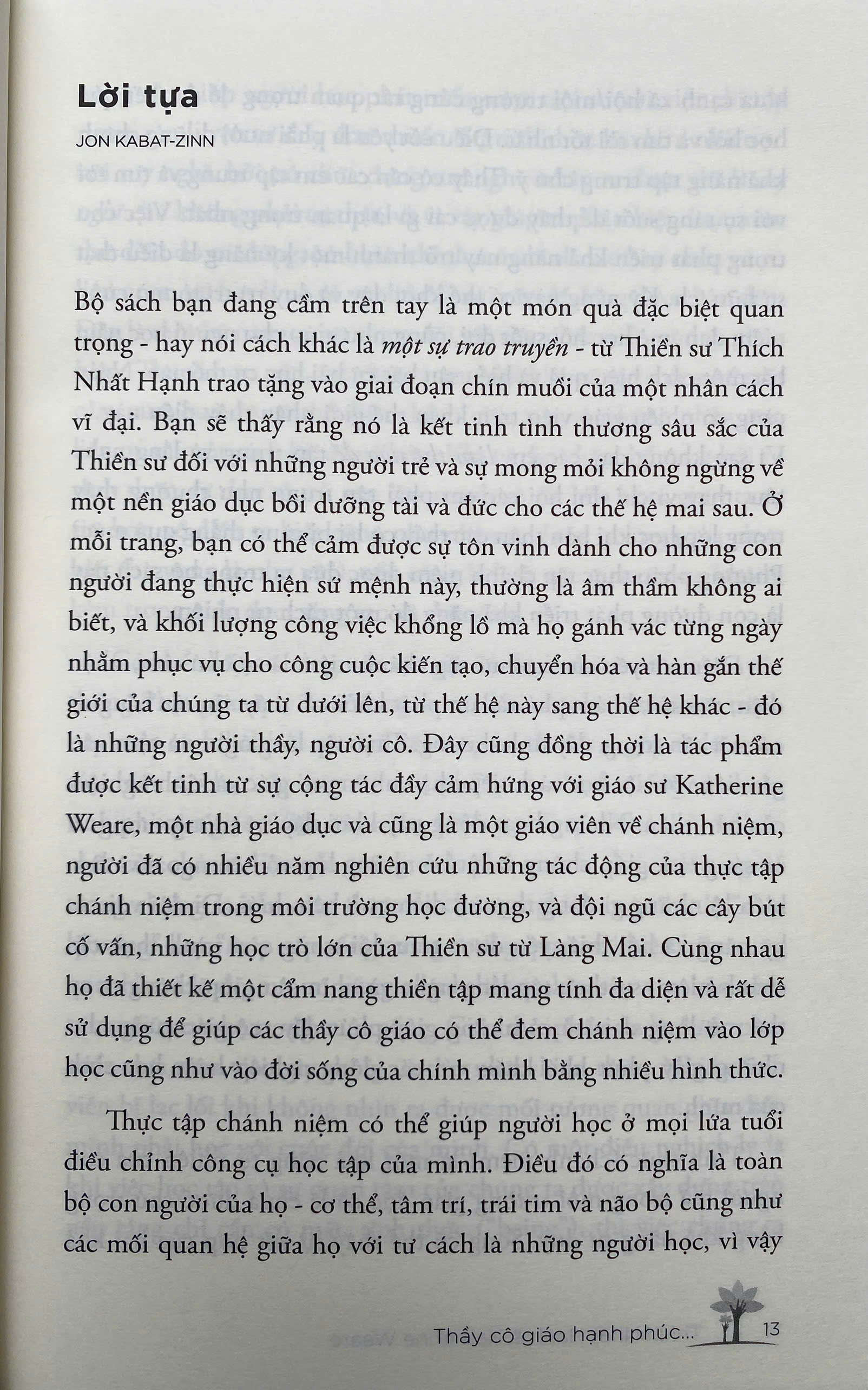 “Thầy cô giáo hạnh phúc sẽ thay đổi thế giới” - bộ sách bạn đang cầm trên tay là một món quà đặc biệt quan trọng - hay nói cách khác là một sự trao truyền - từ Thiền sư Thích Nhất Hạnh trao tặng vào giai đoạn chín muồi của một nhân cách vĩ đại. Bạn sẽ thấy rằng nó là kết tinh tình thương sâu sắc của Thiền sư đối với những người trẻ và sự mong mỏi không ngừng về một nền giáo dục bồi dưỡng tài và đức cho các thế hệ mai sau. Ở mỗi trang, bạn có thể cảm được sự tôn vinh dành cho những con người đang thực hiện sứ mệnh này, thường là âm thầm không ai biết, và khối lượng công việc khổng lồ mà họ gánh vác từng ngày nhằm phục vụ cho công cuộc kiến tạo, chuyển hóa và hàn gắn thế giới của chúng ta từ dưới lên, từ thế hệ này sang thế hệ khác - đó là những người thầy, người cô. Đây cũng đồng thời là tác phẩm được kết tinh từ sự cộng tác đầy cảm hứng với giáo sư Katherine Weare, một nhà giáo dục và cũng là một giáo viên về chánh niệm, người đã có nhiều năm nghiên cứu những tác động của thực tập chánh niệm trong môi trường học đường, và đội ngũ các cây bút cố vấn, những học trò lớn của Thiền sư từ Làng Mai. Cùng nhau họ đã thiết kế một cẩm nang thiền tập mang tính đa diện và rất dễ sử dụng để giúp các thầy cô giáo có thể đem chánh niệm vào lớp học cũng như vào đời sống của chính mình bằng nhiều hình thức.