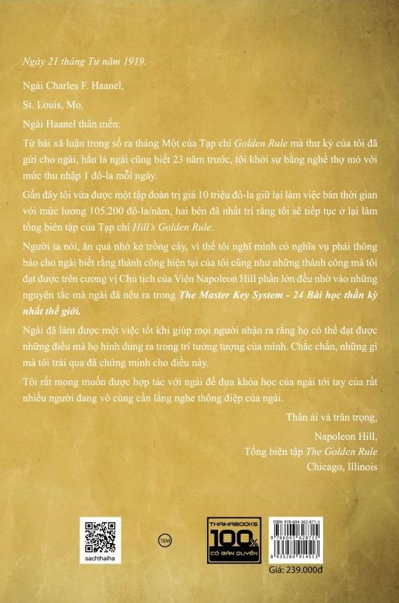The Master Key System không đơn giản chỉ là một cuốn sách hướng dẫn cách trở thành một nhân viên hay một nhà sản xuất tốt, nó không dừng lại ở việc giúp bạn cải thiện tình hình tài chính. The Master Key System mở ra cánh cửa dẫn tới sự thành công toàn diện bao gồm các khía cạnh thân thể, tâm trí, và tinh thần. Trọng tâm của cuốn sách là làm sao để biến một người trở nên vĩ đại. Những ý tưởng và sự quan sát của Haanel tương tự với những ý tưởng đã dẫn dắt các bộ óc thiên tài như Van Gogh, Carnegie, Gates, và Buffet. The Master Key System sẽ giúp bạn khai thác sự thiên tài của chính m.ình.
