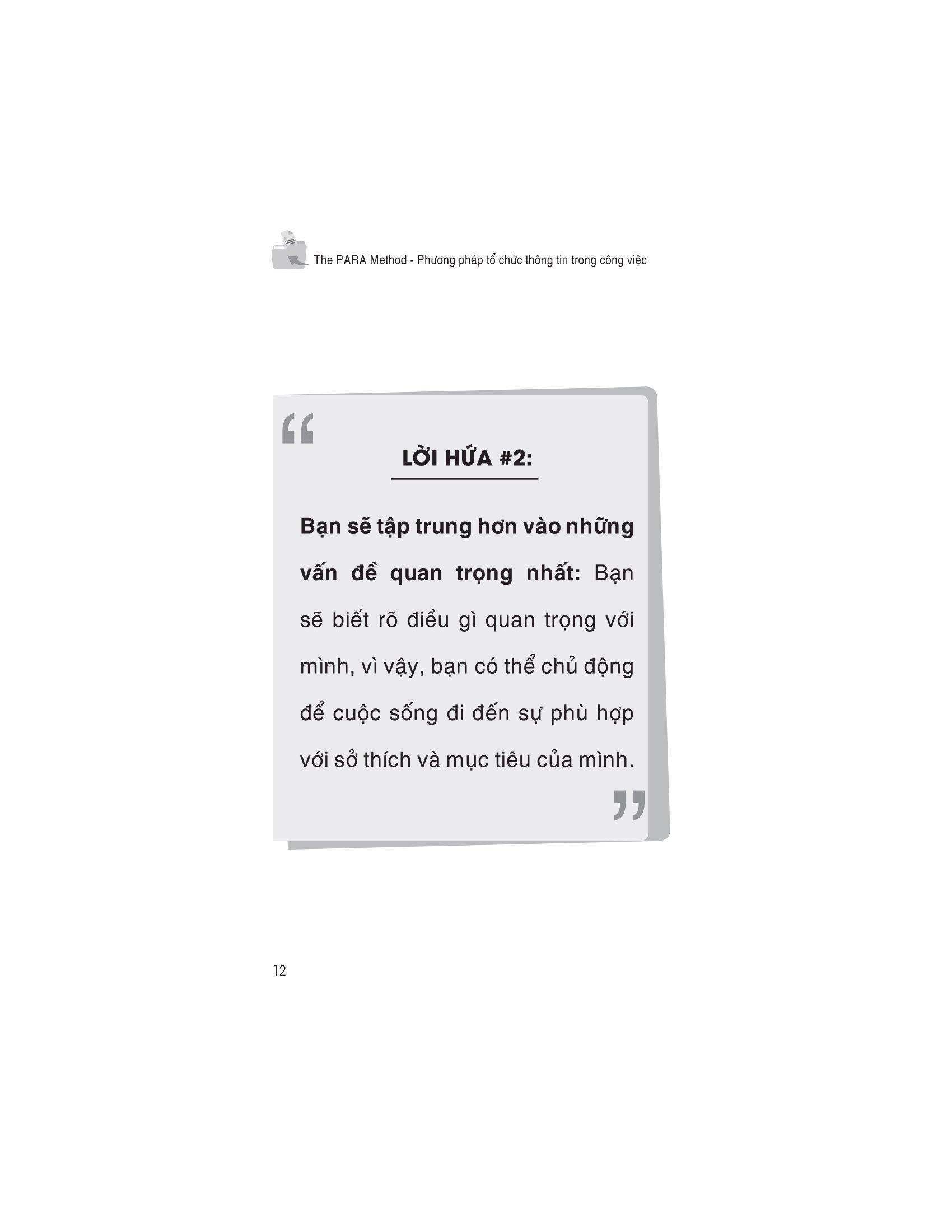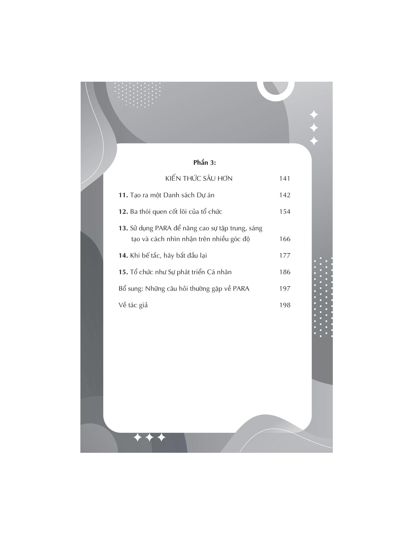 Cuộc sống hiện đại đòi hỏi phải xử lý rất nhiều thông tin. Nhưng chúng ta chưa bao giờ được dạy cách quản lý thông tin một cách hiệu quả để có thể tìm thấy thứ m.ình cần. Trong The PARA METHOD – Phương pháp tổ chức thông tin trong công việc, Tiago Forte phác thảo một hệ thống bốn bước đơn giản và trực quan sẽ giúp chúng ta sắp xếp tất cả thông tin tràn ngập trong não thành bốn loại chính. Theo đó PARA là từ viết tắt của “Projects” (Dự án), “Areas” (Lĩnh vực), “Resources” (Tài nguyên) và “Archives” (Lưu trữ).