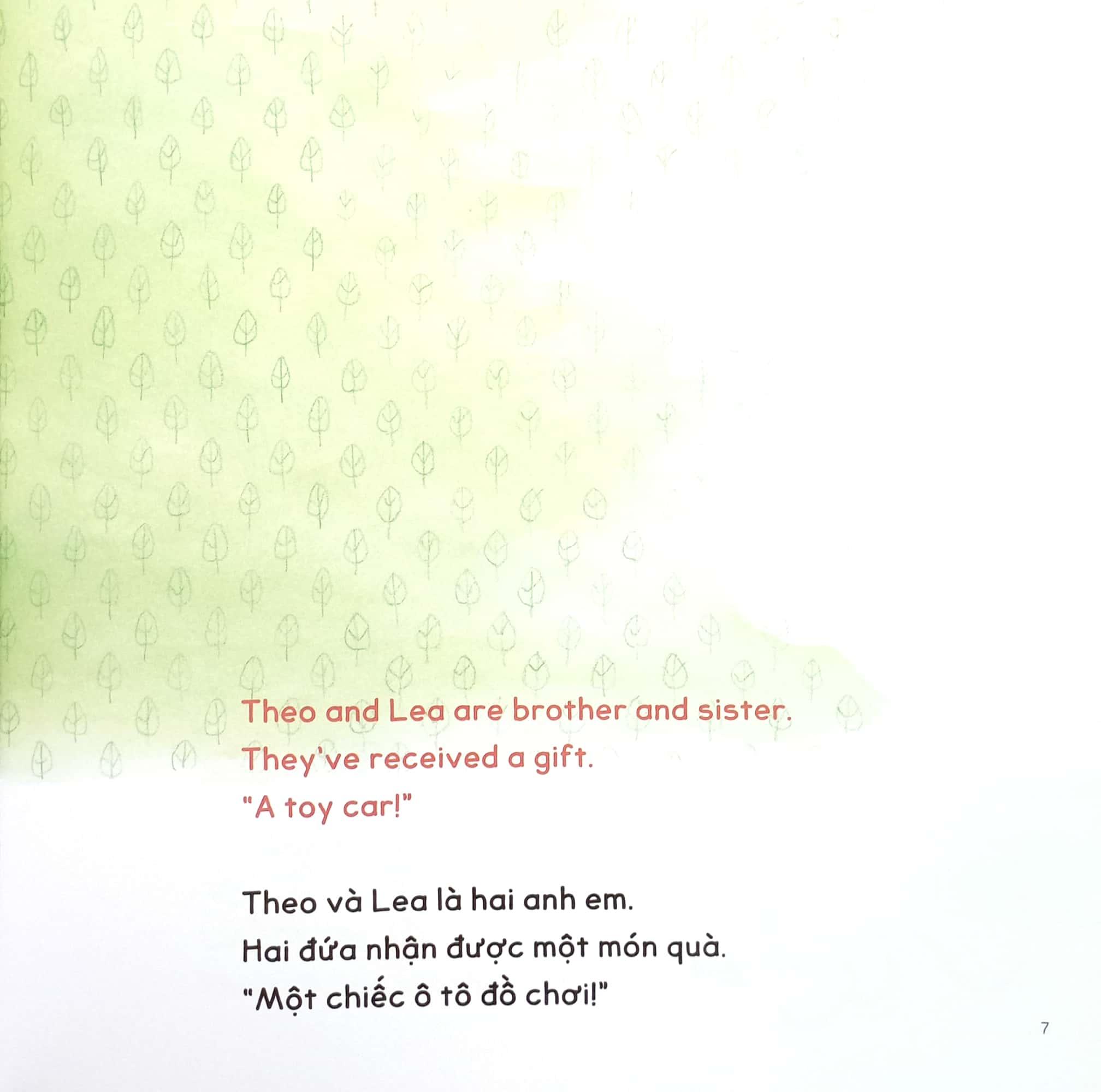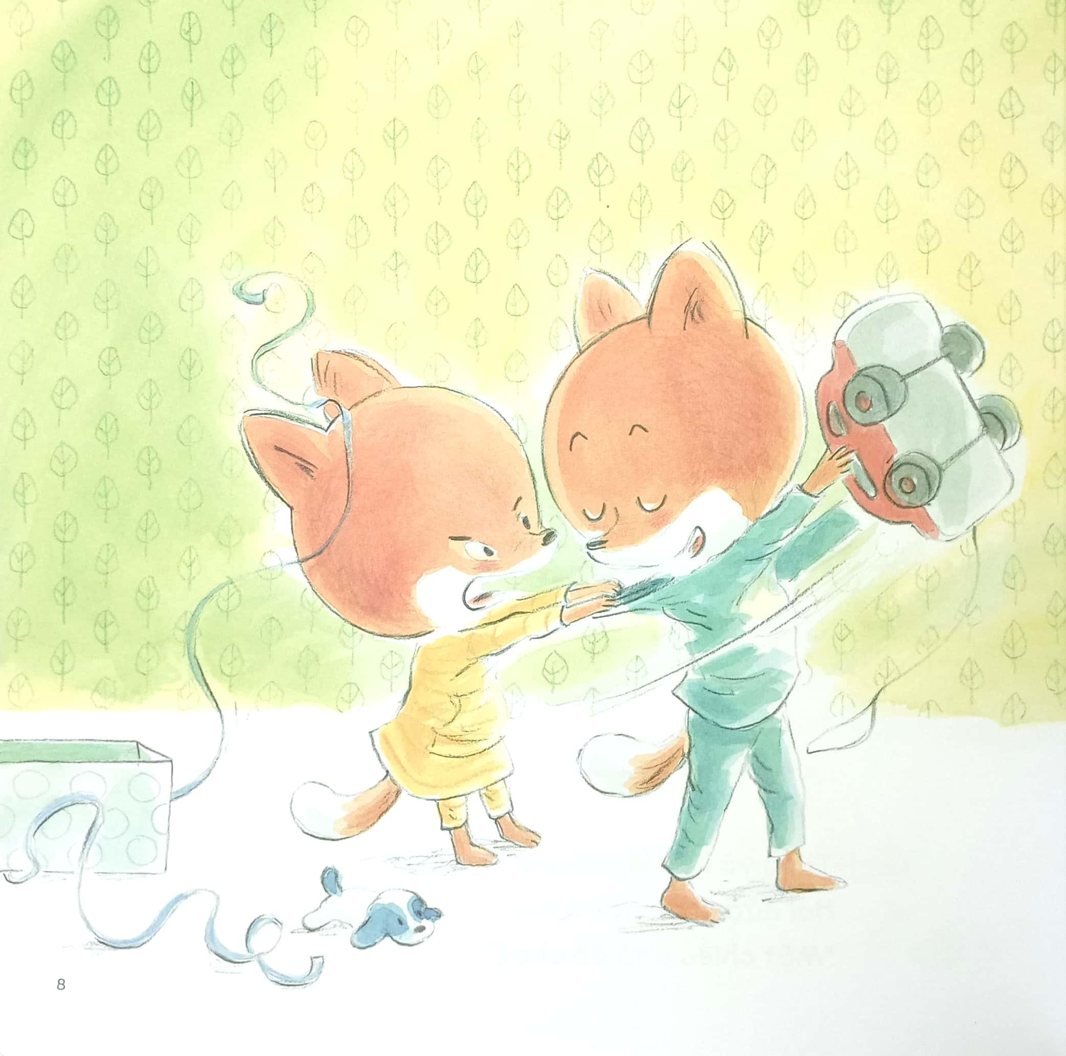 Cuốn sách song ngữ này kể chuyện hai anh em Theo và Lea giành đồ chơi, giận dỗi bỏ đi rồi lại xí xóa trở về bên nhau - "kịch tính" và đáng yêu như bao cặp anh chị em trên đời.