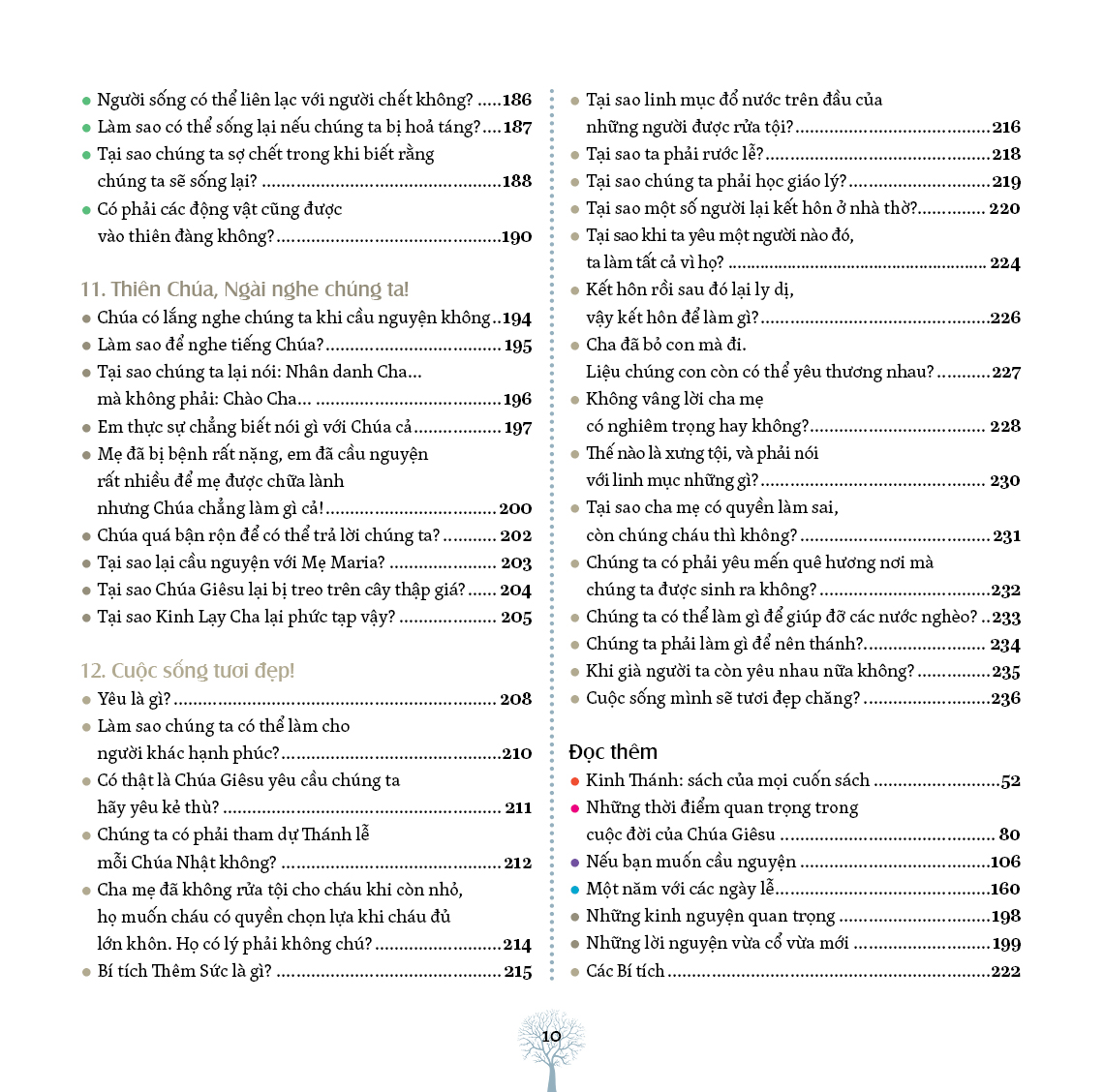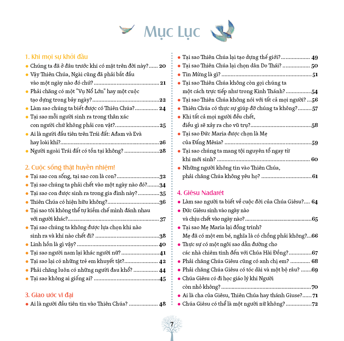 Ai đã trả lời các câu hỏi này? Đó là một nhóm gồm các bậc cha mẹ, nhà báo, linh mục. Những người này có rất nhiều kinh nghiệm nói chuyện với trẻ em về những thứ liên quan đến cuộc sống và đức tin. Họ trả lời rất nghiêm túc những câu hỏi mà các em đặt ra. Với sự kiên nhẫn, họ trả lời từng câu một. Đồng thời, họ cố gắng hiểu rõ điều mà mỗi em muốn hỏi. Để giúp các em hiểu rõ, họ sử dụng từ ngữ đơn giản, nhưng không bao giờ đánh lừa các em. Họ nói những gì họ tin, những gì họ biết, những gì họ khám phá trong cuộc sống, những gì đã giúp họ sống đến hôm nay. Đương nhiên, khi tất cả các câu hỏi này được trả lời thì cuốn sách trở nên dày cộm! Bởi vậy, các em không thể chỉ đọc nó một lần từ đầu đến cuối rồi thôi, nhưng phải đọc tới đọc lui. Các em dừng lại khi gặp câu hỏi mà mà chính các em thắc mắc. Hoặc một câu hỏi thú vị khác mà các em chưa từng nghĩ đến. Cứ như thế, qua từng trang sách, ngày này qua ngày khác, các em tiến tới. Các em sẽ khám phá ra những kho báu nhỏ thực sự quý giá giúp các em hiểu thấu các vấn đề, hoặc những sự giải thích khoa học và thú vị. Các em hãy giữ cuốn sách này bên cạnh mình để khám phá mỗi ngày một ý tưởng mới. Khi đêm về, các em thấy mình lớn lên và ước muốn tiến bước trong cuộc sống.